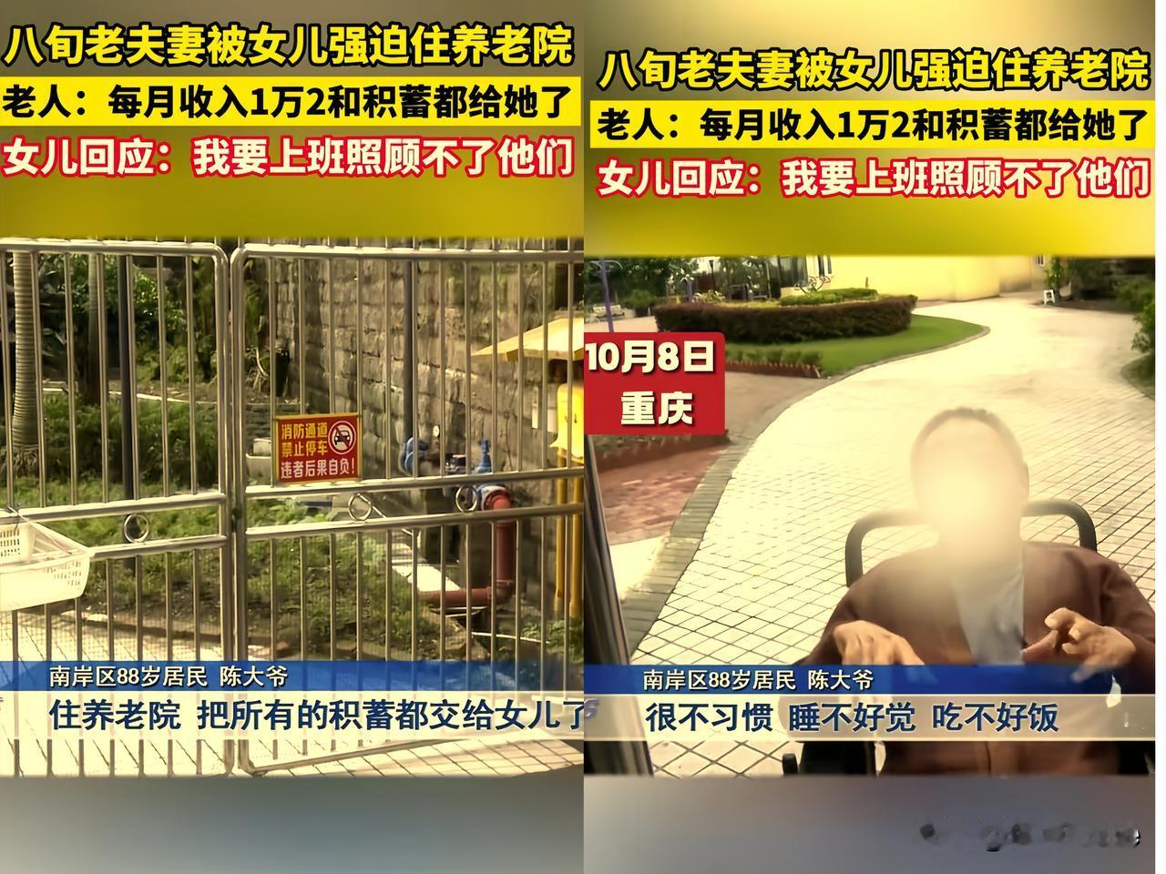 在重庆,有这样一对老夫妻,他们的遭遇让人不禁感叹。老两口每月拿着 12000 元的养老金,本以为能安享幸福晚年, 却没想到被独生女儿送进了养老院。 那是 10 月 8 日,重庆电视台报道了这件事。画面中,88 岁的老父亲坐在轮椅上,满是无奈地倾诉:“养老院里实在太不自由了,怎么都不习惯,晚上睡不好,吃饭也不香,我们真不想住这儿啊!” 可谁能料到,前脚刚把钱给女儿,后脚就被送进了养老院。从熟悉的家中突然来到这个陌生的环境,老人在吃、住、睡各方面都觉得不适应。他们满心期盼,多次央求女儿把自己接回家,然而女儿却以要上班为理由,拒绝了父母的请求。 其实老两口身体都不太好,毕竟年纪大了。老父亲腿脚不灵便,行动需要依靠轮椅;而老伴更是患上了阿尔茨海默症,生活上诸多不便。本应在温暖家中享受天伦之乐的他们,却被女儿送进养老院,女儿倒是轻松了,可老人内心只想回到自己熟悉的家。 看到这一幕,不少人忍不住议论。有人说,老父亲都 88 岁高龄了,女儿也差不多 60 岁了,还上什么班呢?而且老两口退休金也不少,女儿在家照顾父母,就当是上班挣钱,不也挺好吗? 当然,也有人猜测,也许女儿身体欠佳,一个人照顾两位老人实在力不从心,才想着送进养老院,毕竟那里有专业人员照顾,可能对老人更好。但不管怎样,女儿做这个决定的时候,真应该和父母好好商量。要是老人更愿意在家,那请个保姆照顾,不也是个不错的选择嘛。 在养老这件事上,大家都明白,无论是送养老院还是请保姆,都比不上自己女儿亲自照顾来得贴心。但人老了,常常不得不面对现实。子女忙于工作没时间,自己身体又越来越差,要是再生病,那处境就更艰难了,只能听从儿女的安排。 视频中的这位女儿,真该好好反思一下自己的行为。既然自己没办法照顾父母,就别拿老人的钱。让老人用积蓄和养老金请个保姆在家照顾,自己也能安心上班,这样不就两全其美了吗?非要坚持把老人送到养老院,看着老人不适应又难过,实在是让人心疼。希望这样的事情,以后能越来越少发生。70后养老困境 养老院困局