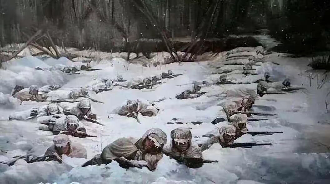 天气让钢铁都失去温度,志愿军在雪原中靠意志推进,口袋里揣的一小把炒面就是粮,雪就是水。