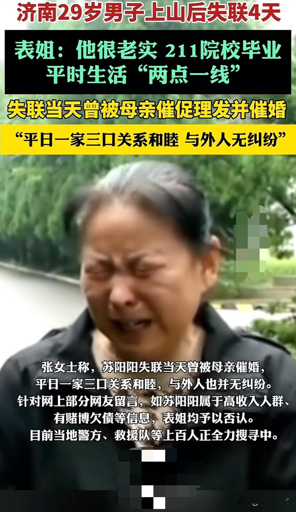 催婚受不了?济南29岁男子上山后失联四天,据悉当然他被母亲催婚,并要求理发,但是否与此相关不得而知 其表姐说男子很老实,还是211大学毕业,平时生活也就是“两点一线” 估计也就是因为这样所以一直没谈对象,所以家人着急了,失联的当天母亲说了他几句,如今家人急得团团转 希望平安归来吧,就算是不喜欢催婚,也不应该离家出走,大家说对吗?
