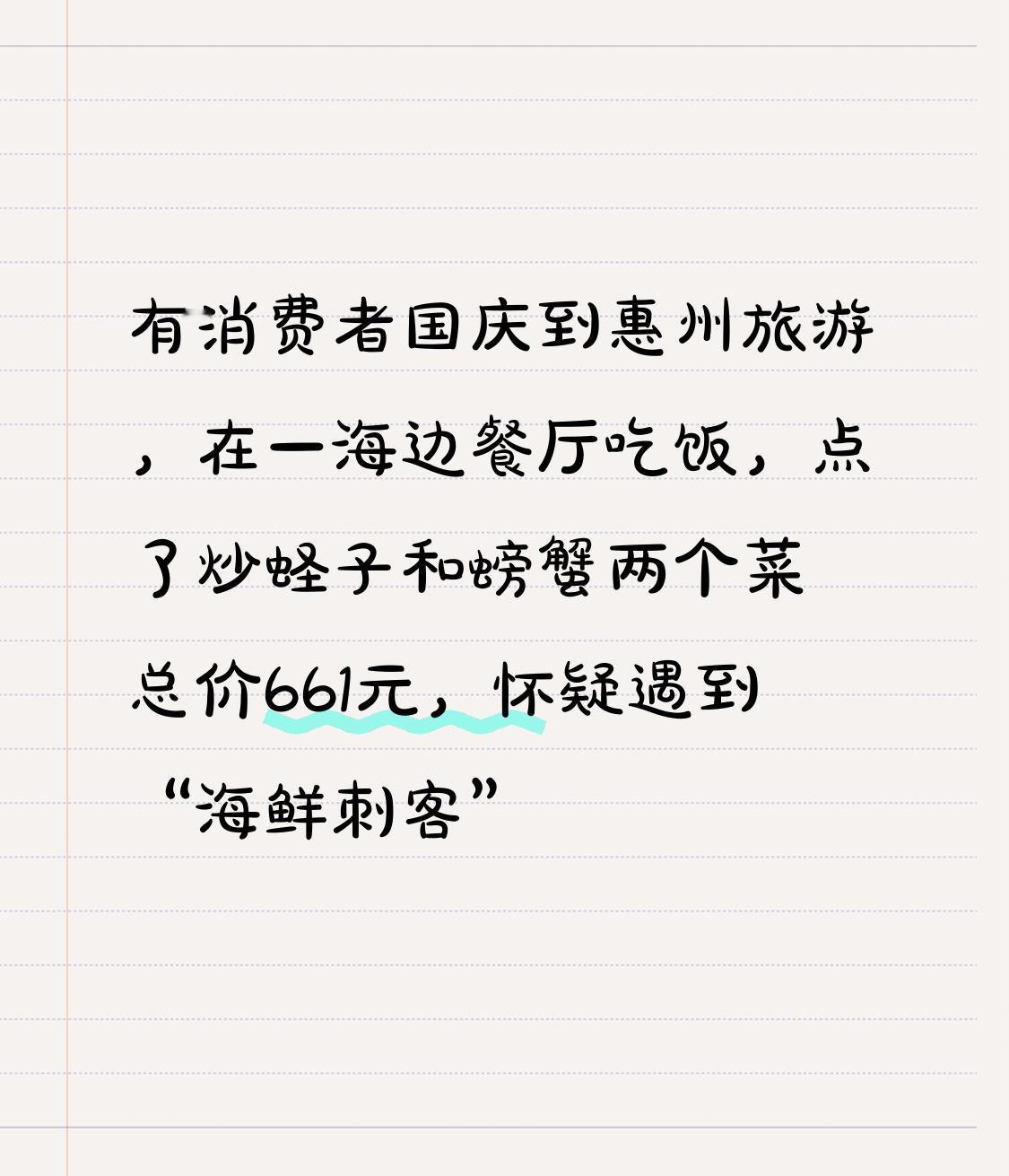 【老掉牙的话题:有消费者国庆到广东惠州旅游,在一海边餐厅吃饭时,点了炒蛏子和螃蟹两个菜总价661元,怀疑自己遇到“海鲜刺客”】 国庆期间,“惠州海边餐厅两菜661元”话题登上热搜。有游客杨先生称原本想团购,到店被告知团购过期,问价时店家不说,吃完报价这么贵,怀疑遇到“海鲜刺客”。 但餐厅老板表示,点菜时已告知价格和斤数,实际收费比标价低。膏蟹188元/斤,顾客点的2.4斤;蛏子68元/斤,点了3斤,再加上6元茶位费,共661元。老板还会公开监控,强调明码标价。目前属地部门已介入协调,杨先生已删投诉视频,疑似双方达成调解,真相究竟如何,就等后续结果了。 海边海鲜店宰客确实是个老掉牙的话题了。之前去海边旅游,进了一家看着挺正规的海鲜店。挑海鲜时,老板热情得过分,推荐的都是贵价货。结账时,价格高得离谱,一只普通的螃蟹居然要几百块。一问,说是按“两”算,可点菜时根本没提。 后来和当地人聊,才知道这种宰客手段很常见。有些店用死海鲜冒充活的,或者在秤上做手脚。大家去海边玩,选海鲜店可得擦亮眼睛,多问多比较,别让宰客坏了旅游的好心情。