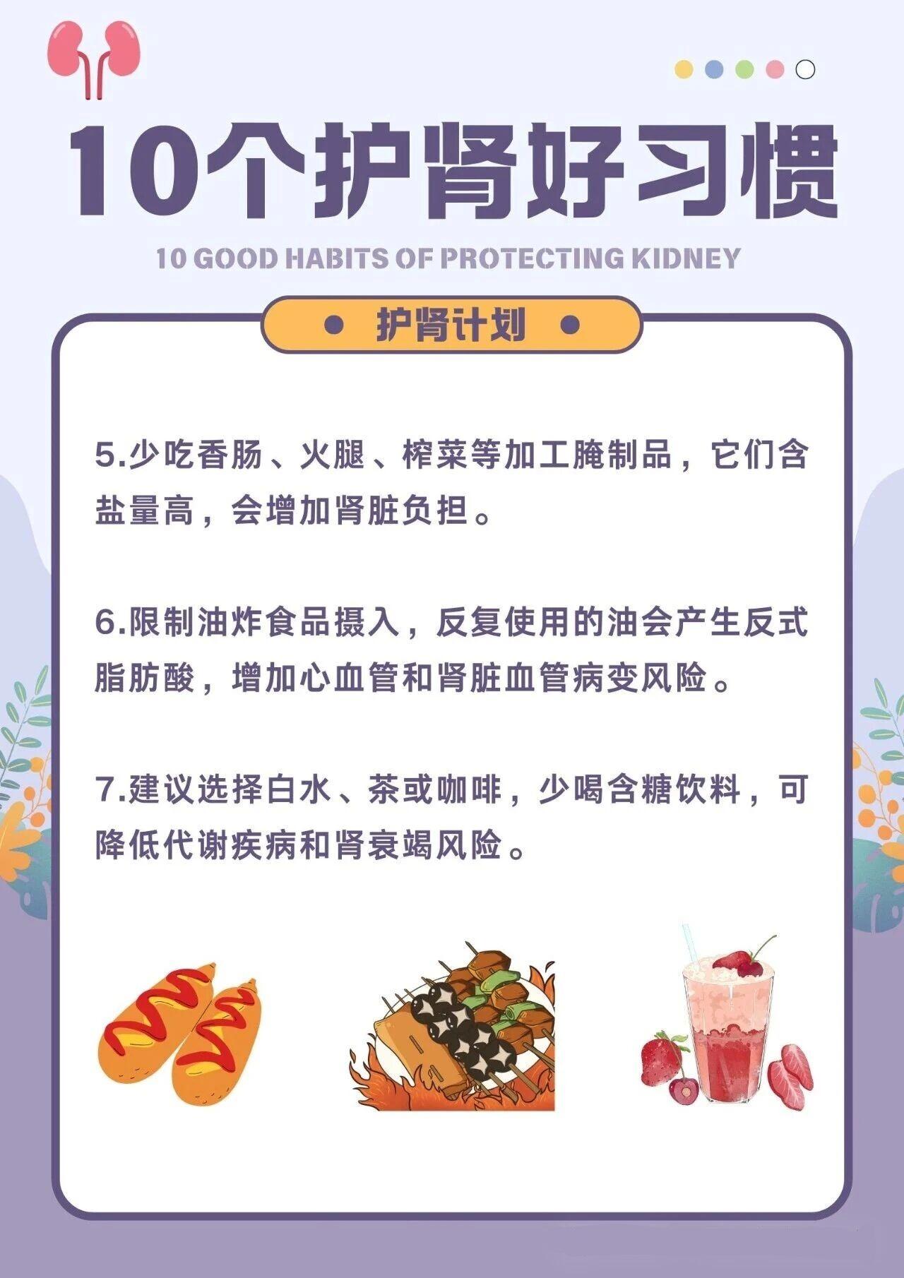 4.控制盐分摄入。过量食盐加重肾小球滤过负担,建议每日摄盐不超过3克,少吃重口味外卖和零食。