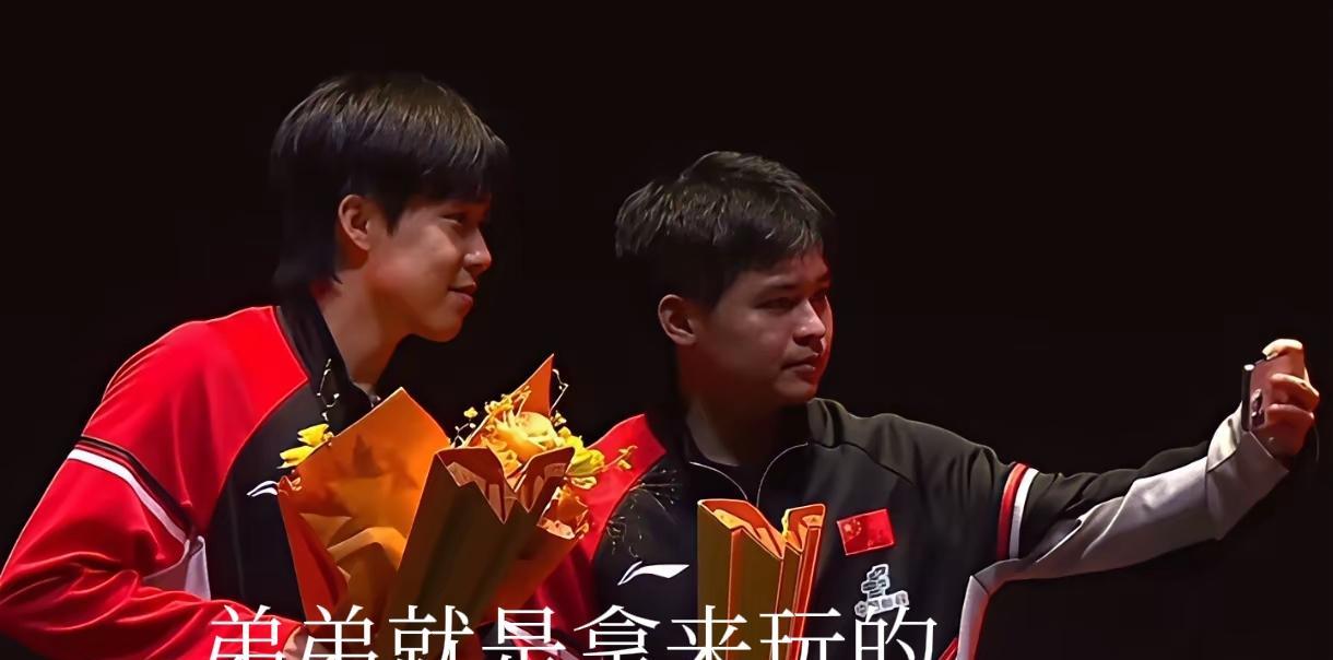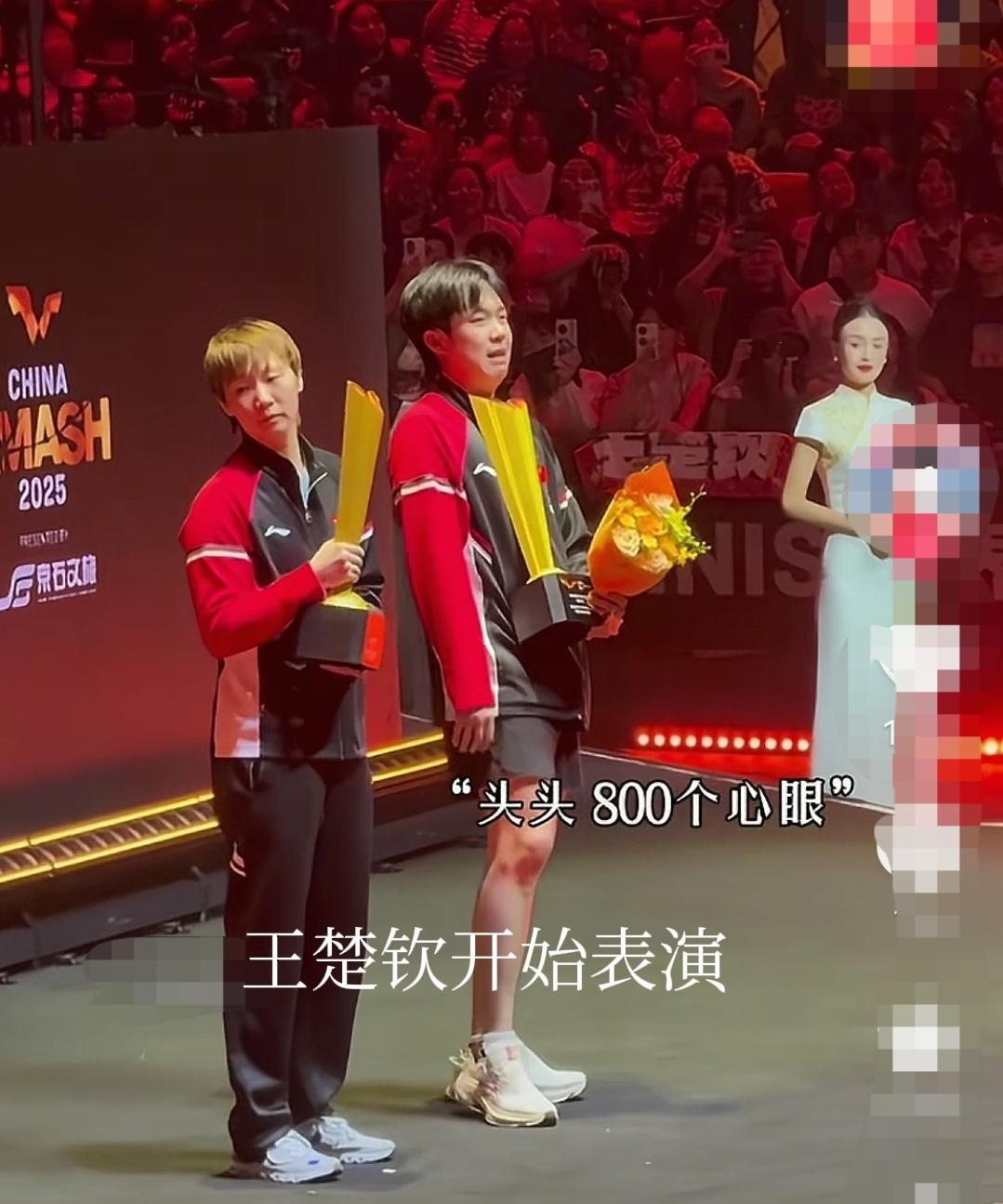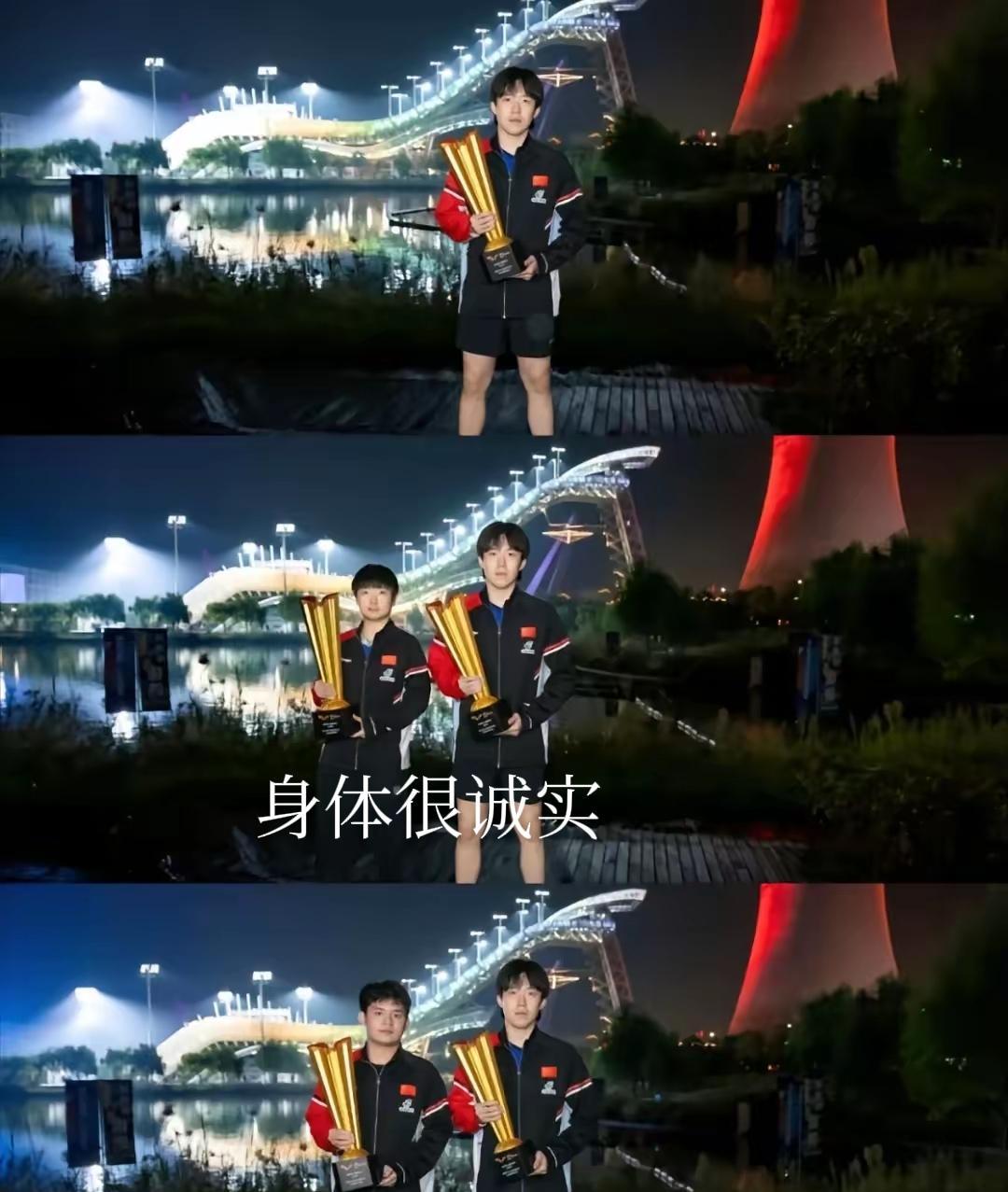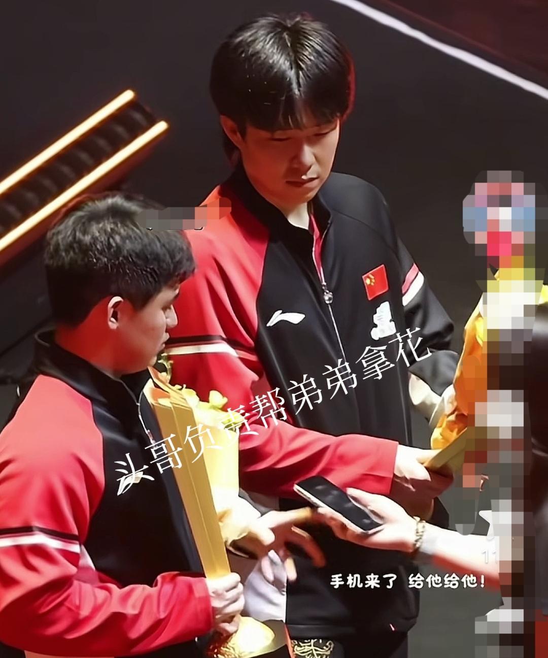 原来王楚钦还有这么双标的一面,王楚钦的八百个心眼子,全部用在了姐姐和弟弟身上,至于混双搭档那跟其他人是不一样的。 到了男双项目颁奖后,这个男双冠军得主是男双组合王楚钦、林诗栋,面对肉乎乎的弟弟,自拍环节王楚钦示意工作人员把手机给林诗栋,小石头也嫌奖杯太重,最后王楚钦拿了林诗栋的捧花,算是减轻了弟弟的辅导。 最后一个奖项是男单项目的颁奖,但是男单冠军冠军最后还有一个跟女单冠军合影的环节,王楚钦面对曾经的“王炸组合”的姐姐,毫无伶香惜玉之情,现场工作人员手机还没有递过来,王楚钦已经开始了他八百个心眼子的表演,他首先甩了甩右手,而且还是面带痛苦表情的那种,也许曼昱早就习惯了这个不懂事的弟弟,曼昱只能默默地拿起手机拍照,角度还要征求一下那个头的意见。 WTT大满贯赛事颁奖后还有一个冠军城市宣传照的环节,从王楚钦身后的灯光来看,王楚钦跟混双搭档合影的时候,很明显王楚钦的身体是偏离身后的灯光的,身体靠向莎莎的一侧,再看王楚钦跟林诗栋男双冠军的合影,王楚钦的身体是靠近身后的灯光的,很明显王楚钦在向自己的身体左侧靠拢。 人与人之间的关系真的就是藏在细节里,除了看到自己的混双搭档无条件靠拢,其他人必须保持距离,原来你是这样的王楚钦。 #晒图笔记大赛#