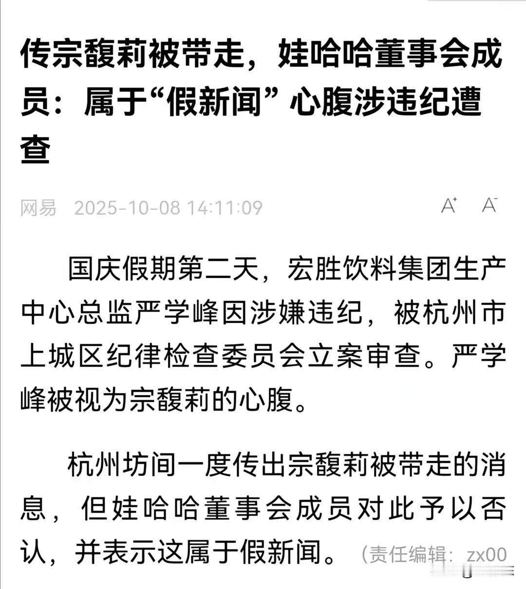 杭州坊间宗馥莉被带走, 尽管娃哈哈有关人士立即澄清, 但是没想到事情发展到这一步了! 消息一出,娃哈哈相关人士连忙出来辟谣,说宗馥莉一直在家,根本没出门,更别说被带走了。 但这并没有能阻止网友的想象力,这个事情反而有点像抖音上的那种“被带走的都是坏人”的特效,越是澄清,反而让人觉得越像真的。 从7月份到现在,大家从各种各样的信息,拼凑出了豪门家族争产的冰山一角。我们只不过是看了几条新闻,几条微博,就觉得“哇,好狗血啊,这剧情比电视剧还精彩。” 好好的一个品牌,硬生生的笼罩在豪门狗血剧情中,现在大家一提起娃哈哈,第一反应想到的是什么?