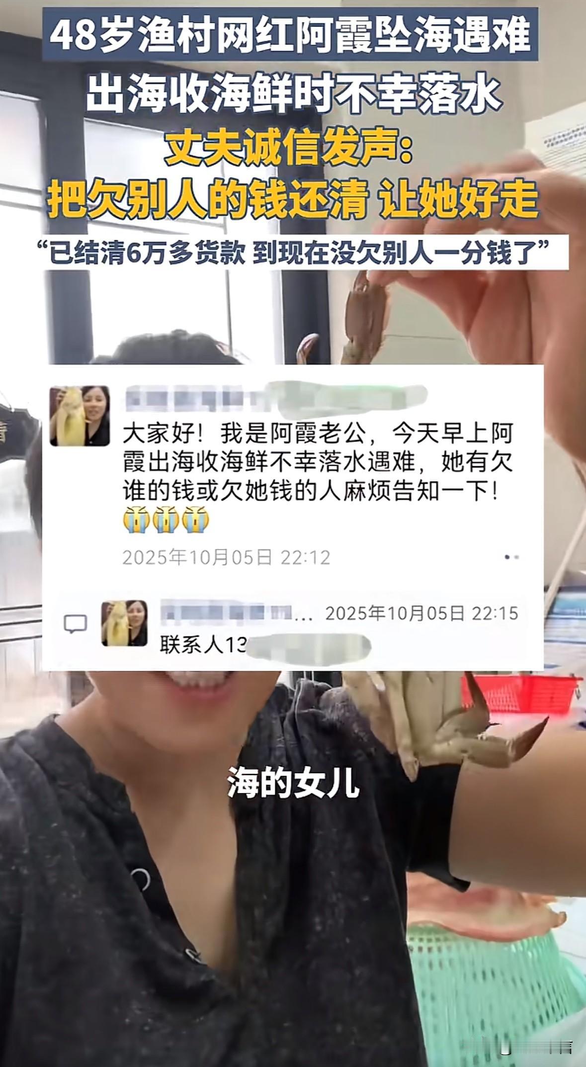 “海的女儿”回归大海了,48岁渔村网红不慎坠海身亡,其丈夫发声“她有欠钱的或者别人欠她钱的麻烦告知一下” 可以看出这对夫妻都是实在人,阿霞曾经说自己是土生土长的海边女人、海的女儿,如今真的与大海“融为一体”了,让人怜悯 她丈夫说已经结清六万多贷款,如今不欠任何人一分钱,但就是不知道可有别人欠她钱 大家说会有人主动说欠她钱吗?