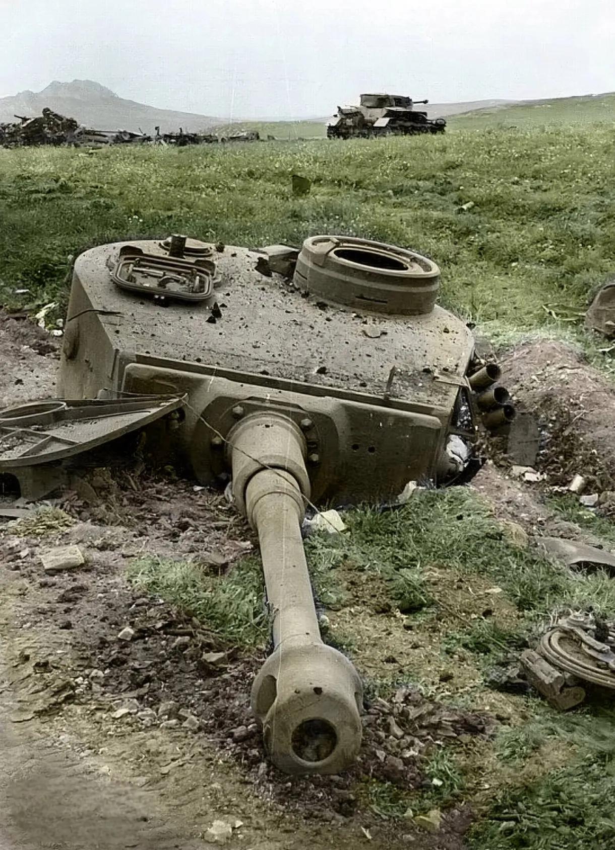 被炸毁的“虎”式坦克炮塔!1943年2月28日,突尼斯亨特山谷,德军501重型坦