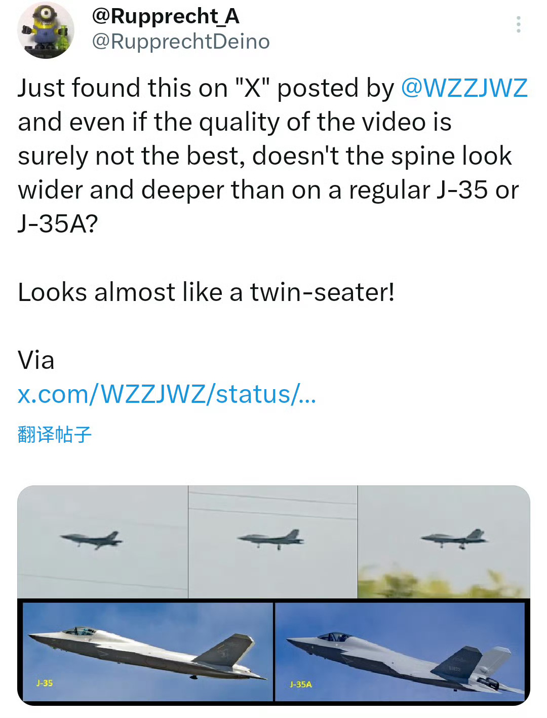 推特上的德国小黄人分析称,近几日流传出的歼-35新视频可能是歼-35系列的双座版。