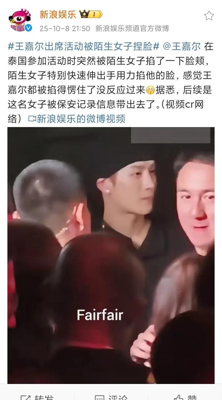 王嘉尔,被吓到了! 10月8日晚上,王嘉尔一则视频冲上热搜,当时王嘉尔在泰国出席活动,突然一名泰国女子冲到王嘉尔面前以迅雷不及掩耳的速度用力捏了一把王嘉尔的脸,当时王嘉尔明显被吓到了,顿时有一些手足无措,而且该女子被安保控制后还大喊“王嘉尔是我老公,我们已经聊了3年!” 网友们普遍觉得有些不可思议: 这种行为太过分了! 做出这么过激的行为已经不能算正常粉丝了。 这就是公然骚扰啊,离谱! 捏的还挺大力的。 明目张胆吃豆腐。 我服了,这是猥亵啊。 已经不是捏了,是掐。 王嘉尔真的可以申请工伤了,再喜欢一个人也要保持一定的距离,有时候尊重他人,也是在尊重自己,追星不应该是追身体,应该是追作品、追人品、追灵魂的共鸣啊!
