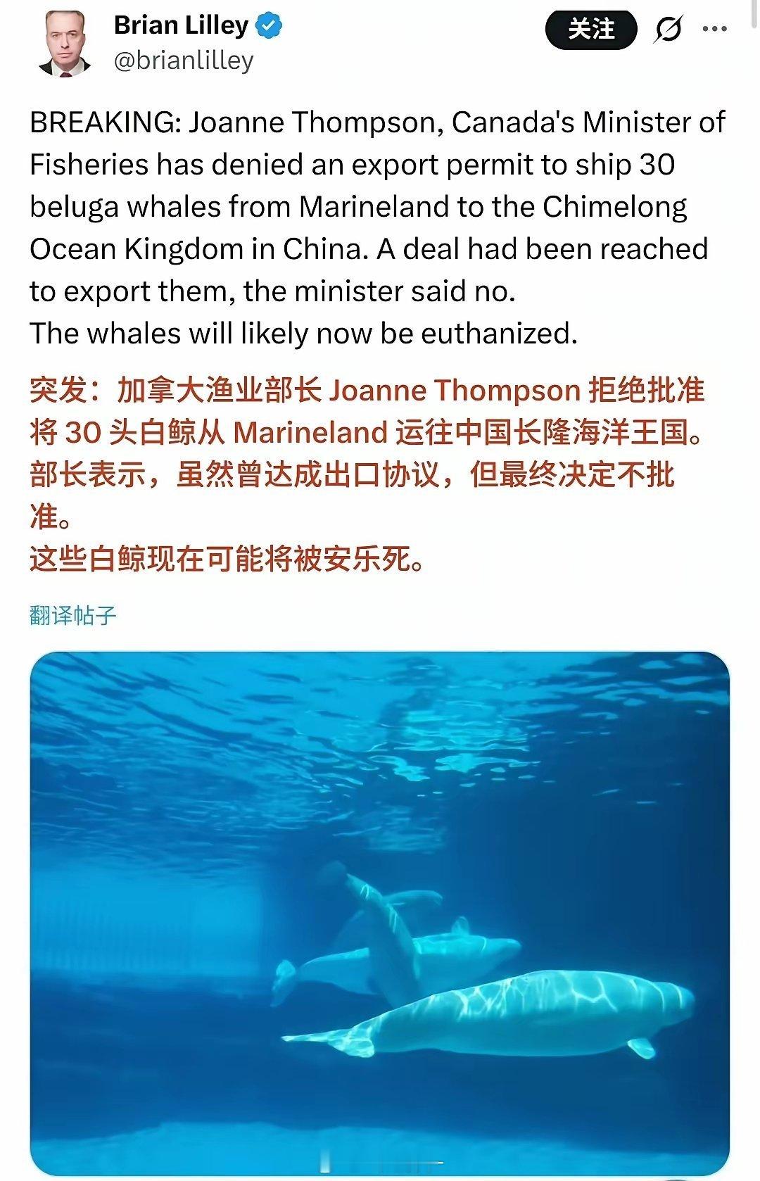加拿大的动物保护组织“动物最后机会”(Last Chance for Animals)也明确反对将这些鲸鱼出口到中国的长隆海洋公园,认为长隆不符合动物福利标准。加拿大鲸类保护联盟等组织则强调,安乐死是避免白鲸长期受苦的“最后手段”……