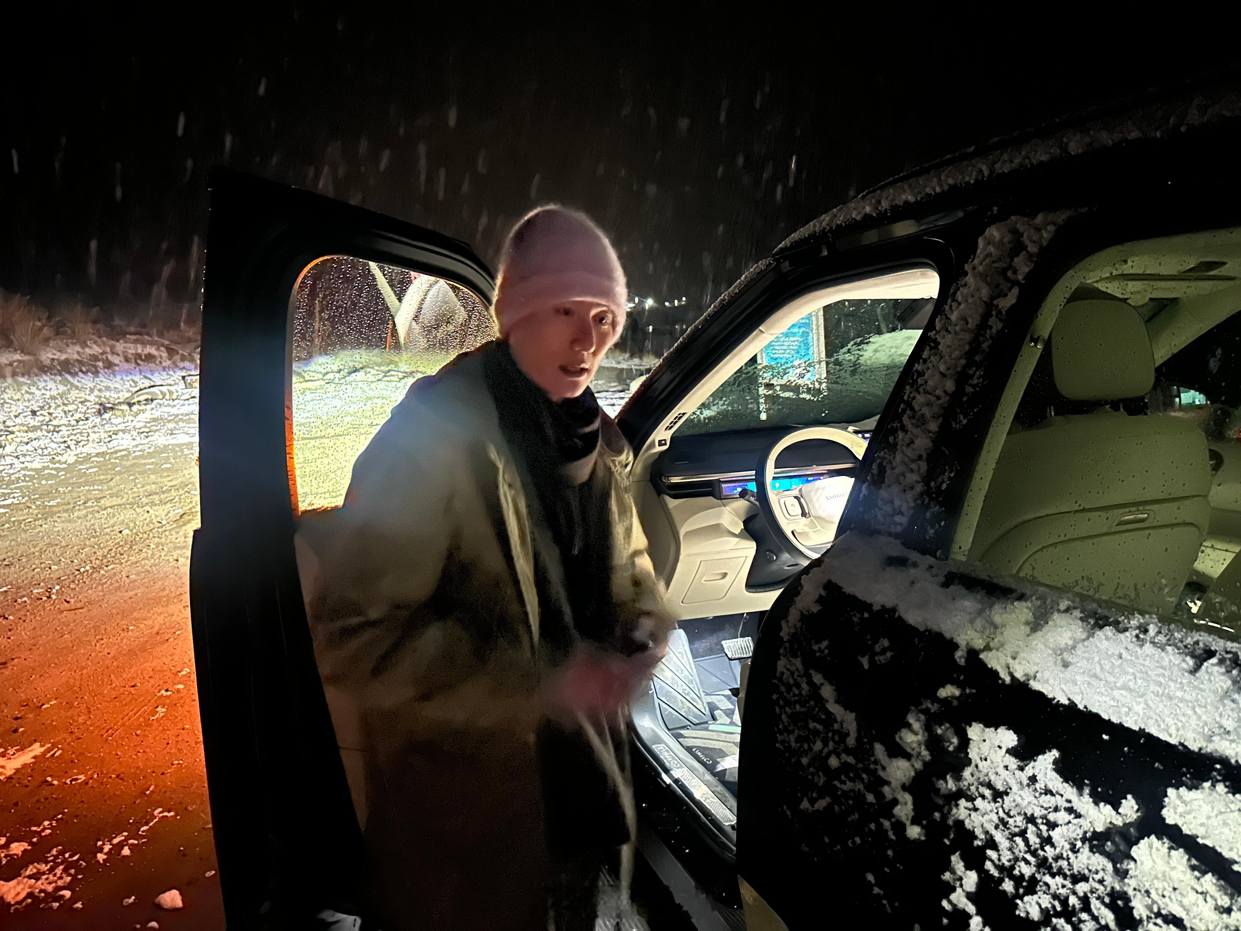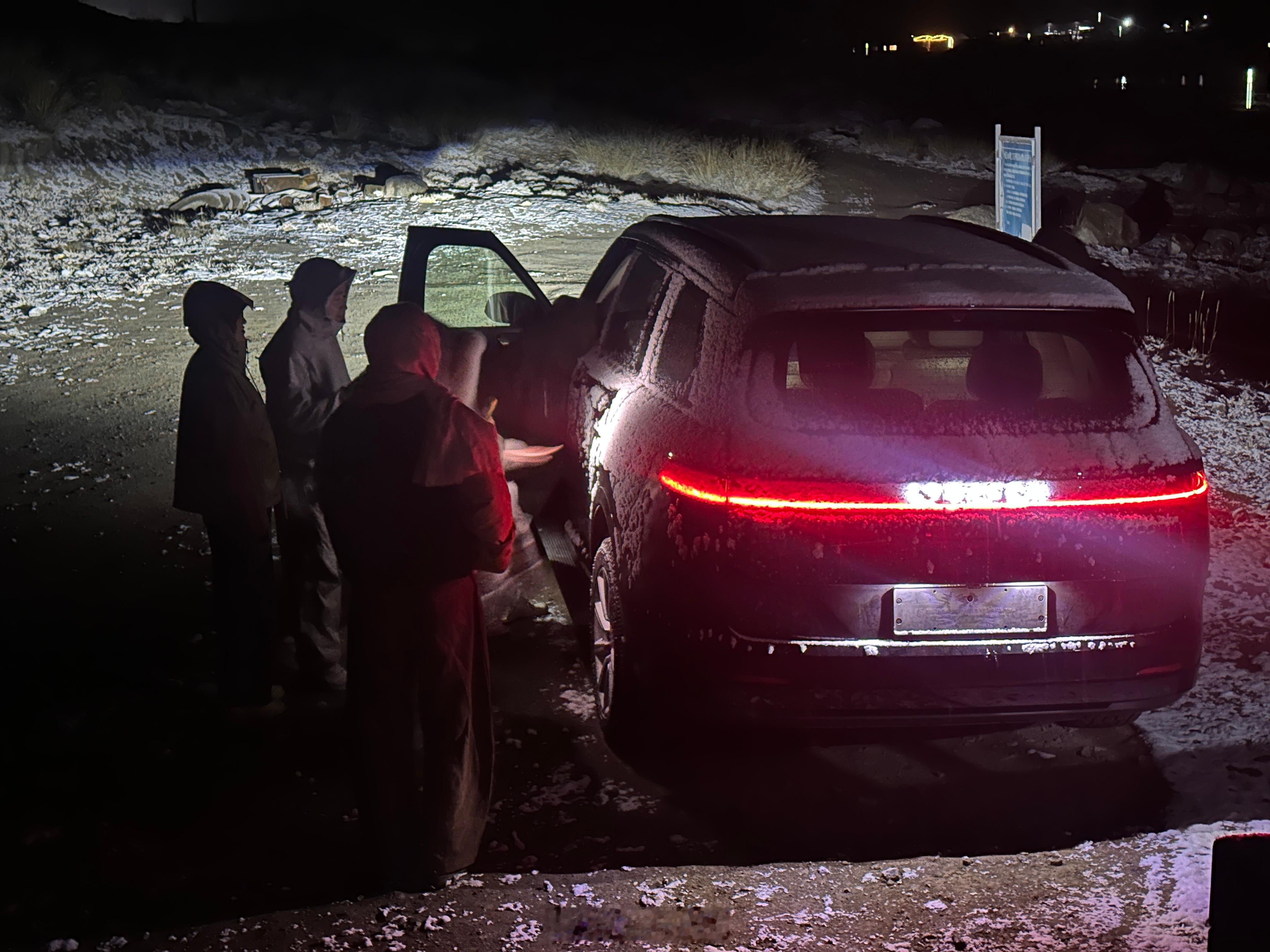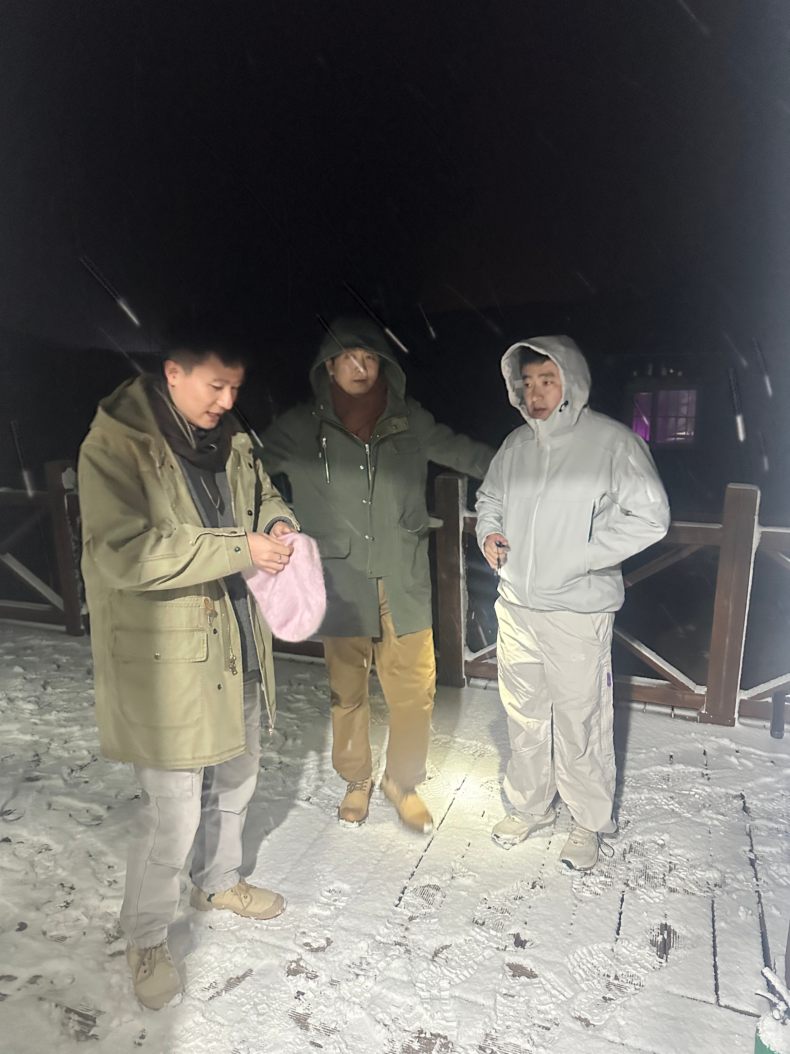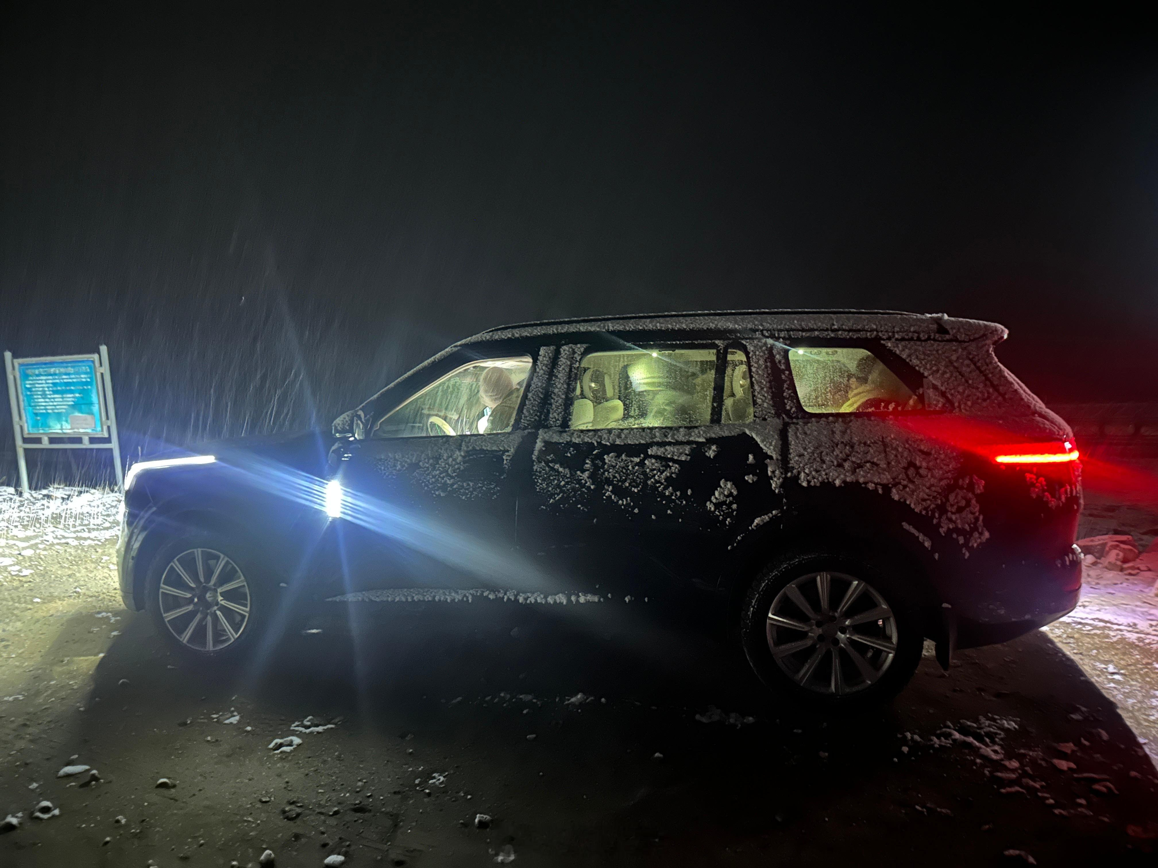 这个点雪山营地下鹅毛大雪,这群人还要去隔壁村里吃饭,领克900上已经积满了雪,体