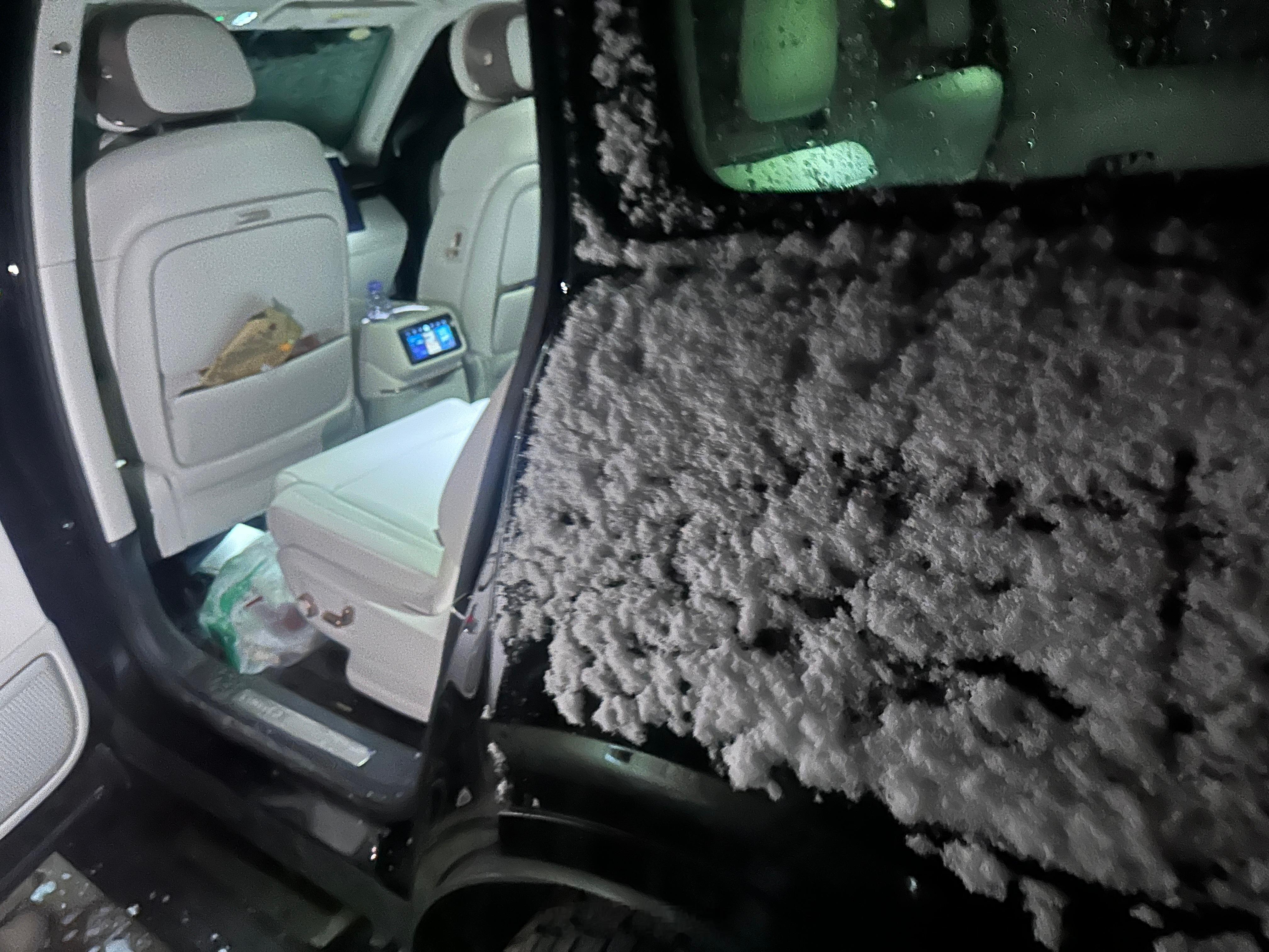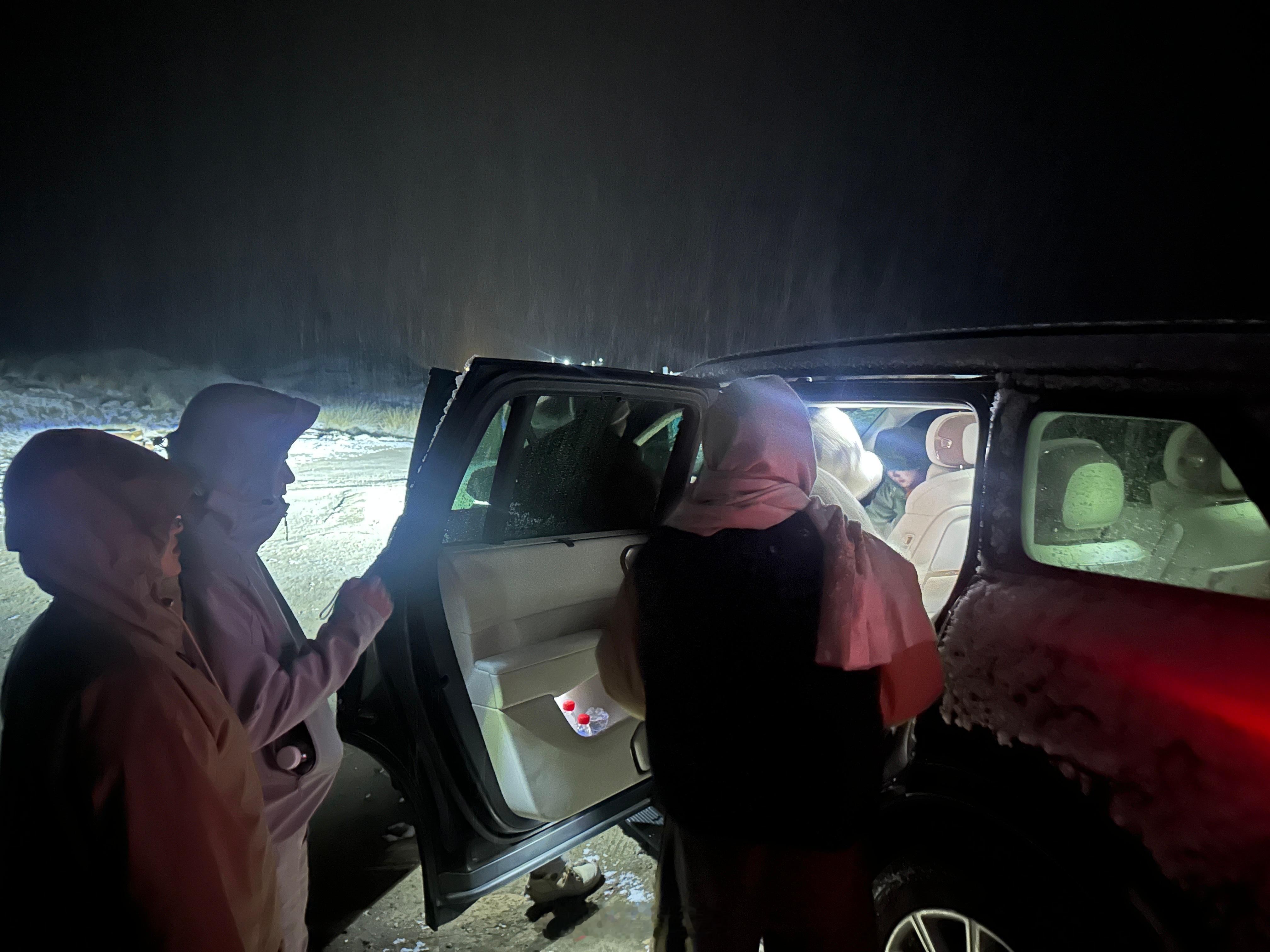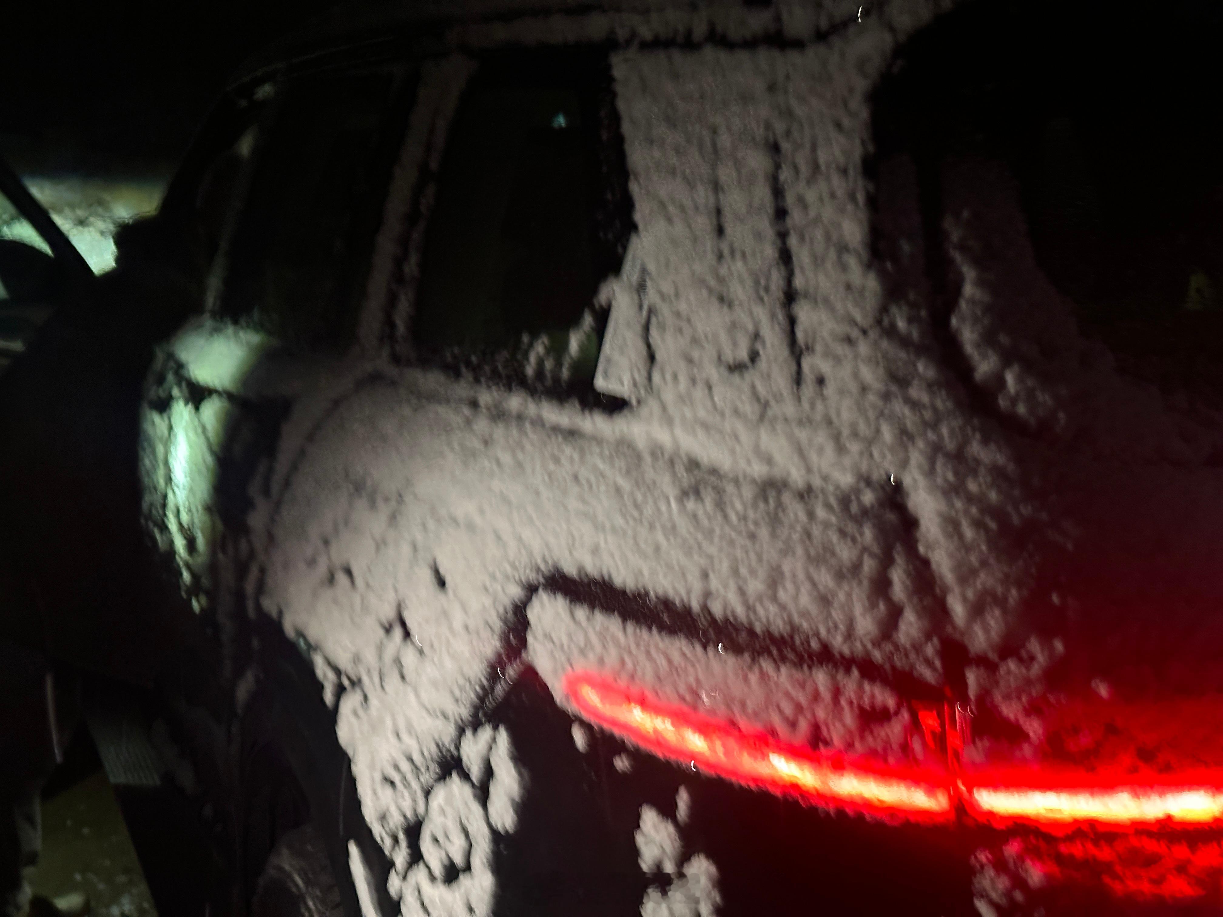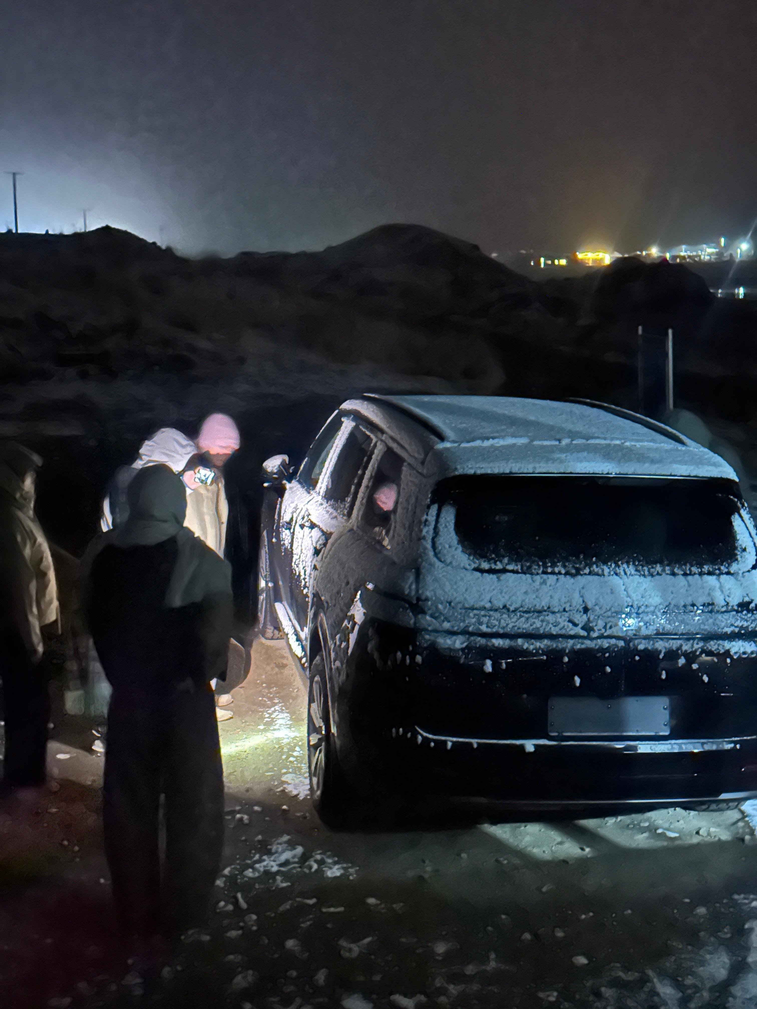 这个点雪山营地下鹅毛大雪,这群人还要去隔壁村里吃饭,领克900上已经积满了雪,体