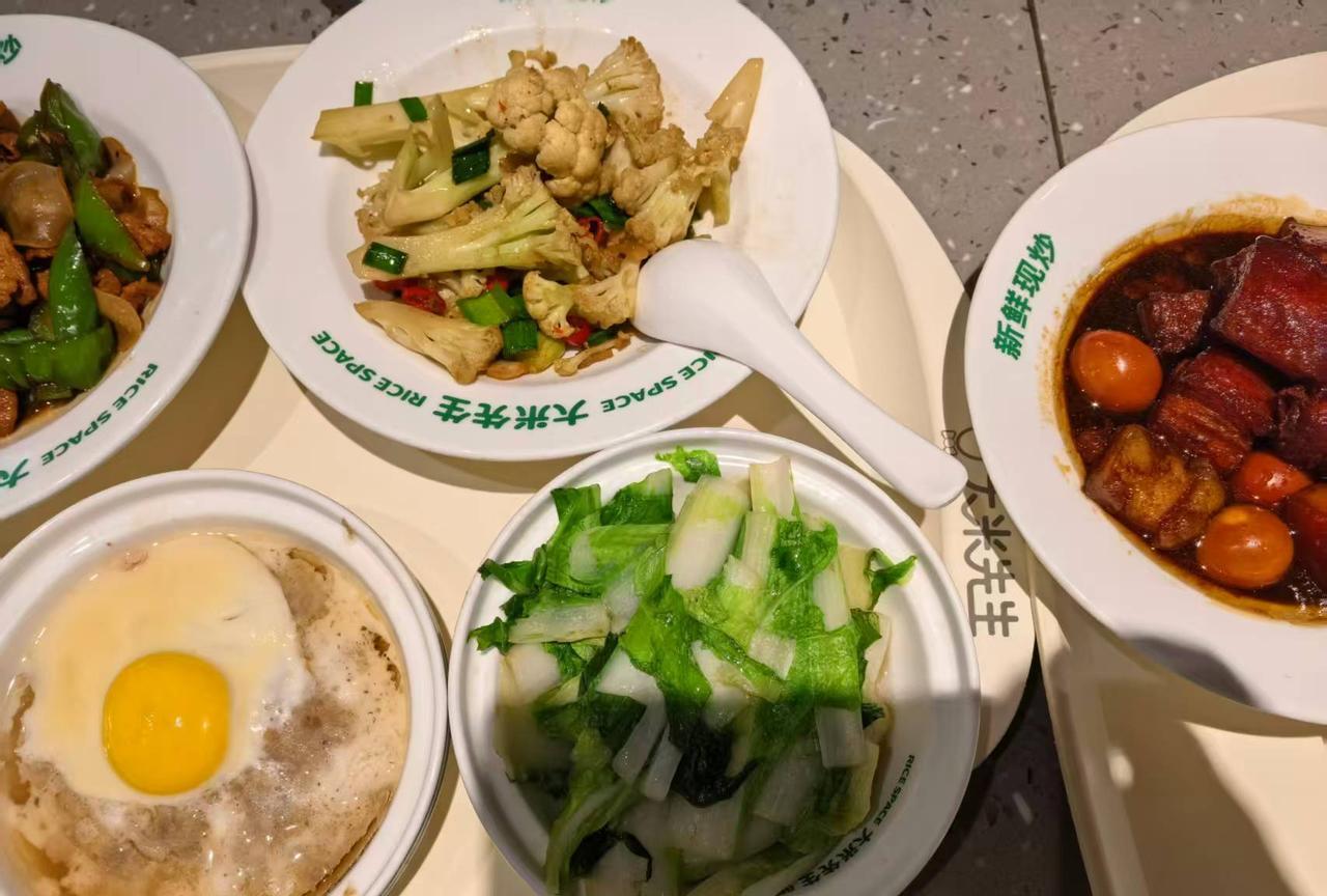 10月4日,听球友说,“大米先生”的菜不是预知的,而是现钞的。 于是我们骑车来到中庚漫游城的负二楼 “大米先生”,“老乡鸡”,紧紧靠在一起。 “老乡鸡”明示了哪些是预制菜;而“大米先生”的开放式厨房中,大火正在炒“农家小炒肉”,香气扑鼻。 “大米先生”有点类似食堂,都摆好了一碗碗,也比较便宜。 我们点了5个菜,红烧肉没吃完,打包带走了。 现炒的菜,确实新鲜又香喷喷,充满锅气、生气。