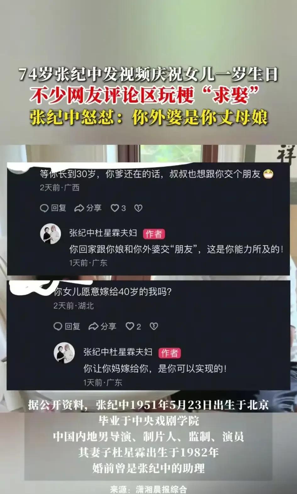 你74娶个小31的天天在网上炫,网友调侃下你就泼妇一样骂街,感觉这老头双标玩的挺溜! 感觉挺丢份的,这老头好像以前拍过一个什么四大名著之类的吧? 忘了三国还是水浒了,好像是制片人吧,还不算是导演。 后来比较出名为人熟知,不仅是标配一副络腮大白胡子。 而且还找了一个小31岁的老婆,经常在网上逛着炫耀。 这不,他74岁了,女儿却刚过1岁生日,又把庆生的视频发到网上了。 网友们自然在下面评论的比较嗨皮。 毕竟74岁了,老婆小了31岁。 女儿才1岁嘛,这种巨大的差距。 这帮吃瓜网友能不评两句皮一下吗? 有一些嘴有点“麻辣”的网友。 就调皮地在下面喊起了丈母娘,老丈人,老岳父。 没想到一下给老头喊急眼了,在评论区的回复简直不堪入目。 就像泼妇骂街一样,说让那些网友娶自己的妈!娶自己的外婆! 喊自己的外婆叫丈母娘,喊自己的爹叫岳父,还可以娶自己未来的儿媳妇。 这样子骂人就太有辱斯文了吧? 不管怎么样,也算是著名导演了。 拍过传统的四大名著之一二。 又是互联网上的网红。 这点格局都没有吗? 再说这不是明显的玩双标吗? 你自己可以74岁娶小31岁的老婆。 那人家网友说自己30岁,等着她1岁的女儿长大娶她。 这调侃没什么大毛病吧? 怎么就这么恶毒的去骂这些网友呢? 各位网友,怎么看呢?欢迎评论区留言讨论