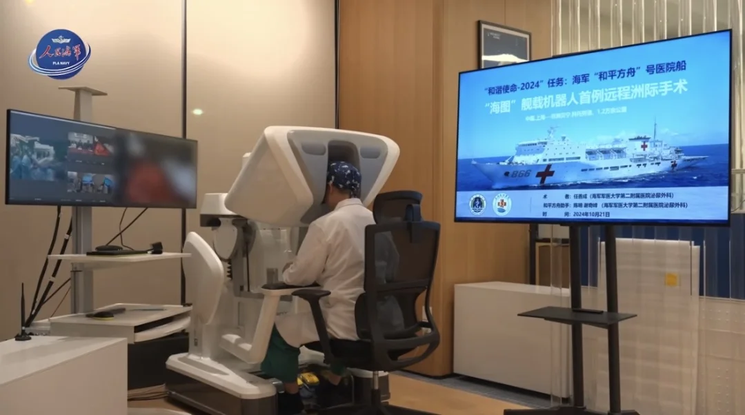 去年中国海军的医院船搭载海图舰载手术机器人,医生在上海的海军军医大学第二附属医院操作,为一位非洲贝宁患者完成了复杂肾囊肿手术,刷新了全球机器人手术的最远操作记录。