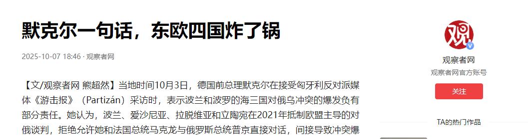 默克尔这回真把窗户纸捅破了!前两天她接受匈牙利媒体采访时说得明明白白:俄乌冲突闹到今天这个地步,欧盟那几个上蹿下跳的国家脱不了干系! 欧盟这几个 “上蹿下跳的国家” ,正是波兰和波罗的海三国 —— 爱沙尼亚、拉脱维亚、立陶宛。这四个国家跟俄罗斯的过节能追溯到好几代人,波兰历史上三次被俄罗斯瓜分,二战时还发生过卡廷惨案,波罗的海三国以前是苏联加盟国,总担心被重新掌控,所以打心底里对俄罗斯又恨又怕,成了欧盟里出了名的 “反俄急先锋”。 2021 年 6 月其实有过阻止冲突的机会,当时俄罗斯已经在乌克兰边境调动兵力,局势像烧到临界点的油锅。默克尔和法国总统马克龙急得不行,联合提出要搞个新的对话机制,直接跟普京坐下来谈,想把火苗浇灭。可这提议刚一出口,就被波兰和波罗的海三国联手怼了回去,他们骂这是 “绥靖政策”,说跟普京谈判根本没用,硬是把这最后的外交机会给搅黄了。 默克尔后来回忆说,就是这次分裂让局势彻底失控了。本来欧盟搞外交就得抱团,可这四个国家一门心思要强硬,根本不管集体利益。那会儿新冠疫情正严重,各国领导人没法当面沟通,本来就难达成共识,被他们这么一闹,统一的对俄政策直接泡汤了。等默克尔卸任,德国没了主心骨,没人再能牵头搞务实的对话,边境的火药桶没过多久就炸了。 冲突爆发后,这四个国家更是把 “上蹿下跳” 发挥到了极致。波兰不光给乌克兰送了大批坦克、火炮,还开放边境让西方武器源源不断地运进去,自己的军队也往边境挪,摆出一副要直接下场的架势。波罗的海三国更激进,爱沙尼亚直接把全国 1% 的 GDP 都拿去援乌,立陶宛还敢扣俄罗斯的物资,生怕冲突不够激烈。 他们这么折腾,其实是把欧盟架在了火上烤。本来德法这些国家还想留着谈判的余地,可架不住这四国天天在欧盟里喊 “不制裁就是帮凶”,逼着其他国家跟着搞一轮又一轮的对俄制裁。结果制裁没打垮俄罗斯,反而让欧盟自己吃了大亏,能源价格飙上天,工厂因为缺天然气倒闭不少,算下来两年多损失了 1.5 万亿欧元,老百姓冬天取暖都得精打细算。 更要命的是,他们的强硬态度彻底堵死了和谈的路。俄罗斯本来还愿意坐下来谈,可看到欧盟被这四国绑着一直送武器,觉得谈了也白谈,干脆硬扛到底。乌克兰那边也被他们鼓着劲,觉得有欧盟撑腰就能打赢,不肯在领土问题上让步,两边就这么耗成了拉锯战。塞尔维亚总统武契奇后来都说,要是默克尔还在位,凭着她的务实劲儿,肯定能把谈判促成,战争说不定就打不起来。 这四国为啥非要这么 “上蹿下跳”?除了历史恩怨,还藏着自己的小算盘。波兰一直想当东欧的 “老大”,借着反俄攒存在感,提升自己在欧盟和北约的地位;波罗的海三国国力弱,怕被俄罗斯欺负,就想靠搅和冲突绑紧美国和北约的大腿,让他们派兵保护自己。可他们只顾着自己的安全,压根没考虑整个欧洲的利益。 现在默克尔把这事儿说出来,四国立马炸了锅。波兰前总理骂她是 “最具破坏性的德国政客”,爱沙尼亚外长说她是在为俄罗斯辩护,可他们越激动,越像心里有鬼。毕竟明眼人都看得出来,要是 2021 年那回谈判成了,说不定就没有今天的战火,多少人能免去家破人亡的苦。 说到底,俄乌冲突虽然是俄罗斯开的枪,但这四个国家确实在关键节点上推了一把,把能谈的机会变成了能打的局面。默克尔捅破这层窗户纸,不是要帮谁推卸责任,而是想让大家看看,欧盟内部这样各顾各的,只会把自己拖进更深的泥潭。 现在战争已经打了好几年,两边都精疲力尽,美国也开始喊 “以领土换和平”,这四国的激进立场早就不合时宜了,可要是早能听进默克尔的劝,何至于闹到今天这步田地呢?