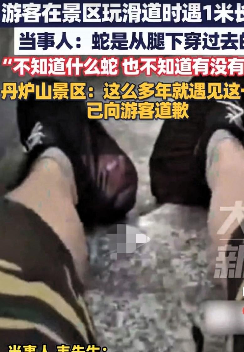 十一期间,广西一游客在玩滑道,正当他往下滑时,一条蛇顺着他大腿根连滚带爬的也跟着