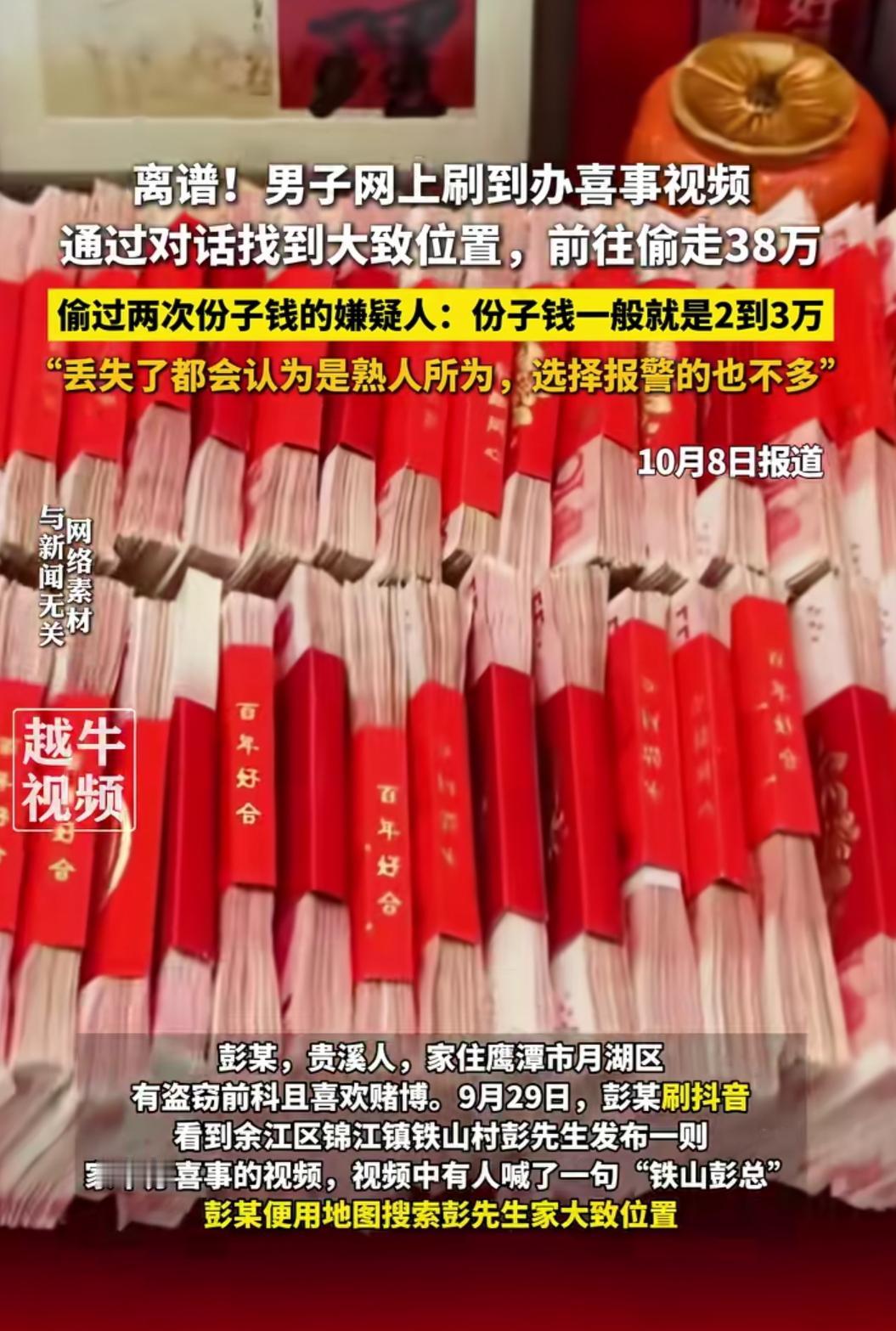 太可恨了!一男子通过网上刷结婚视频方式进行偷盗,通过视频对话确定位置后,便前往偷盗,偷走彩礼38万元,而且这已经不是第一次作案了,前面还有两次,盯得就是谁家结婚偷谁家,你说缺德不缺德! 目前男子已经被抓,据他本人讲,一般偷彩礼比较安全一点,也就2万3万的样子,就是主人家发现钱被偷也不会报警,因为害怕是熟人作案,往往也就不了了之。 男子也是抓住了人性的弱点呀,我想说现在的小偷都开始学习心理学了嘛。但犯了法被抓也是迟早的事,法网恢恢疏而不漏,警告那些不法之人,一旦触犯法律,等待的将是法律的严惩!