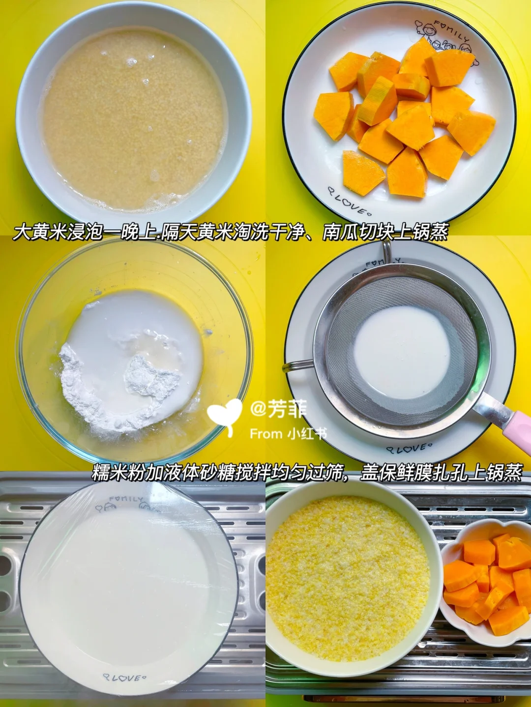 1️⃣大黄米提前一天淘洗浸泡一晚,隔天洗净沥干水分放入容器加入清水,水开上锅蒸30分钟.南瓜去皮切块上锅蒸20分钟蒸熟,可以和大黄米一起蒸