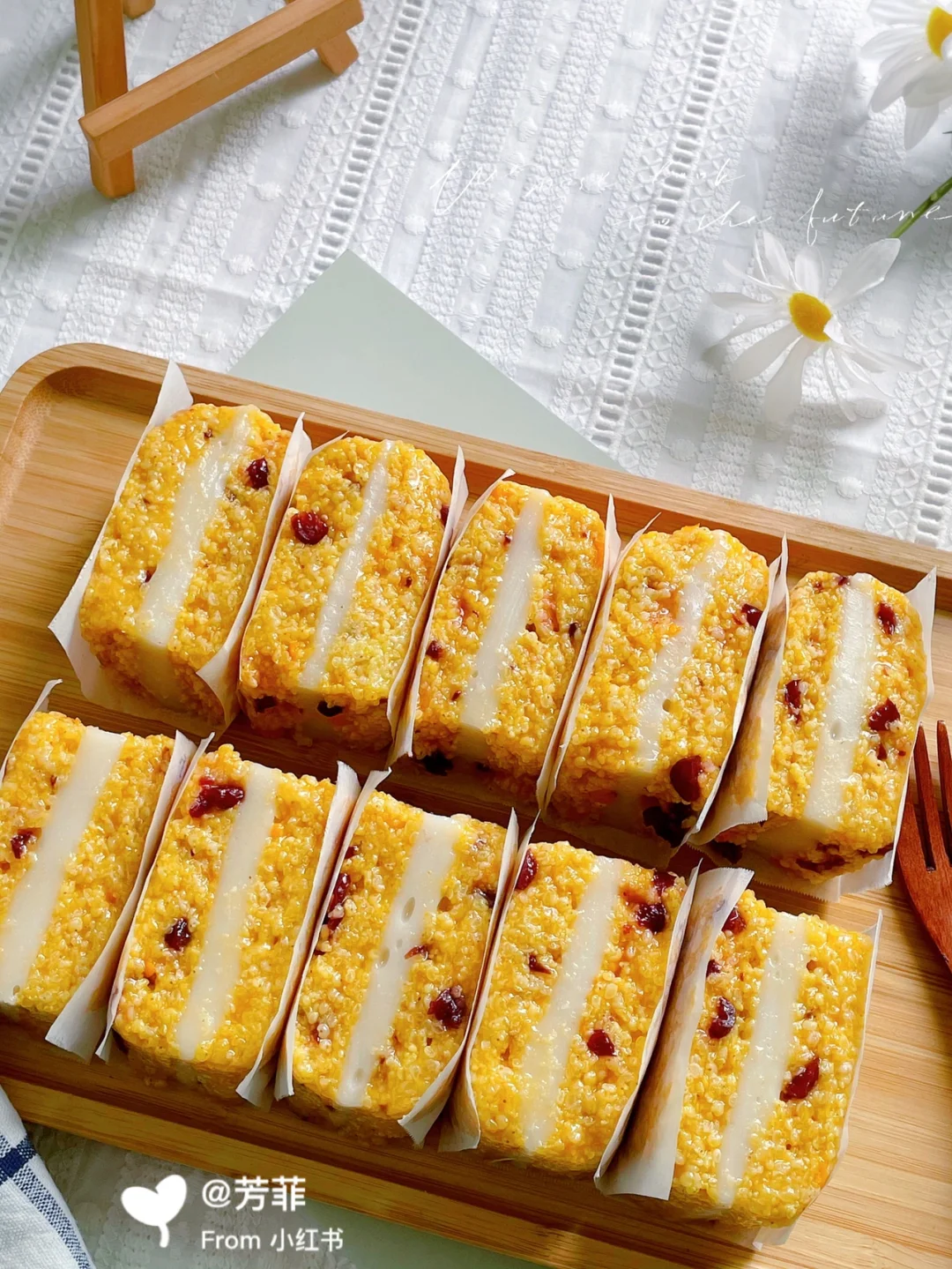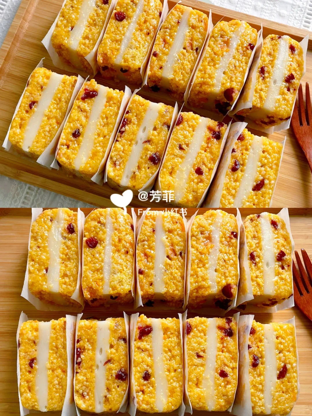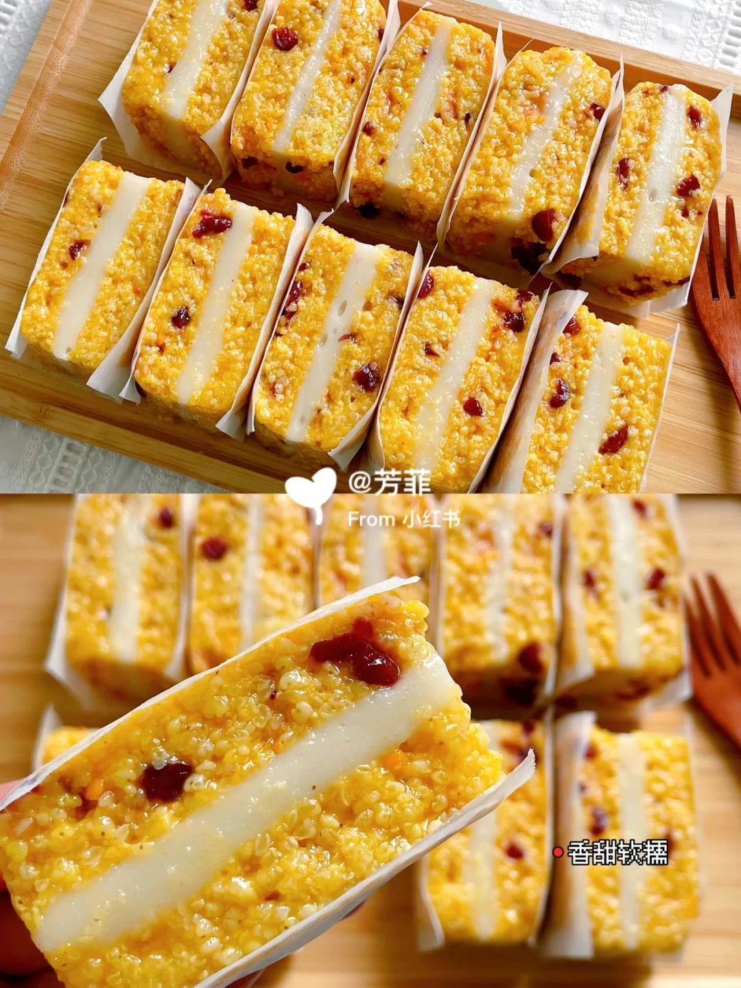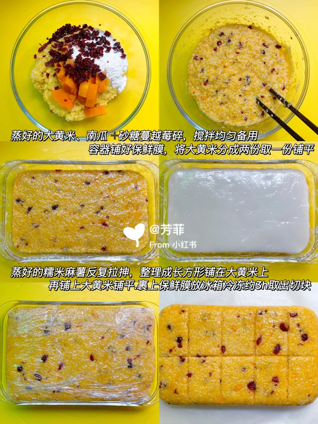▪️黄米凉糕:大黄米300克 清水300克 老南瓜150克 白砂糖50克 蔓越莓干适量