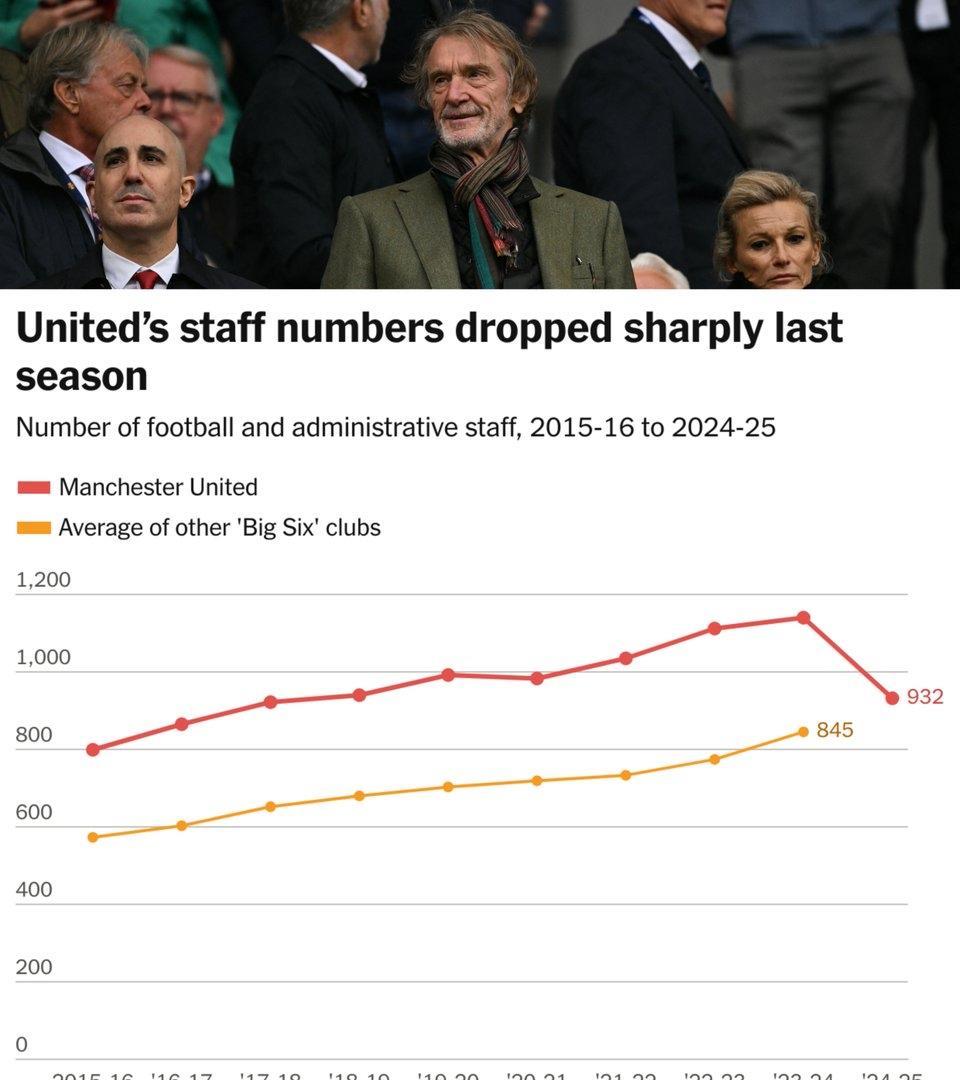 拉爵的目标是让曼联职员人数低于英超前6的平均水平。