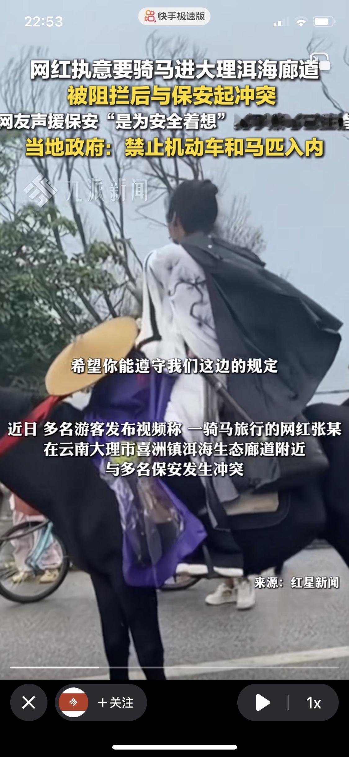 今天刷到两个新闻,一个是网红“完美婆娘”从重庆打车去内蒙古体验“策马奔腾的人生”,一个是网红张某不顾当地规定骑马硬闯洱海廊道并与保安发生冲突。两者都是为博流量在哗众取宠,但作为对比,一个自掏腰包,靠“黄色法拉利”猎奇,实现“梗”想;一个是在刻意对抗规则,制造冲突,博取关注。 不禁引起我对网络生态和“流量病”的思考。流量本身虽无对错,但获取流量的方式有高下。虽然健康的网络环境,需要平台、监管者和我们每一位用户共同维护,但让注意力更多地投向那些真正有价值的内容才是我们所愿。
