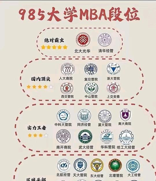 如果MBA也有段位,这些985.211双一流高校的MBA值得选择。 在国内,MBA段位的绝对霸主依然是北大光华和清华经管。 除了清北之外,国内MBA顶尖水平的是人大商院,复旦管院,浙大管院,西交管院,中山管院,上交安泰。 再往下那就是实力王者的中科大管院,同济管院,厦大管院,南大商院,南开商院,武大经管,华科管院,哈工大经管。 可以发现中山管院还是挺厉害的,能够和浙大西交上交复旦人大同处一个梯队,由此可见水平。 没想到中科大管院,华科管院,哈工大管院能够和南开商院,南大商院,厦大管院,同济管院,武大经管一个层次。 还有就是不要误认为理工类院校的管院,商院,经管就不好,你像上面的中科大管院,同济管院,哈工大管院,华科管院都是非常不错的,比一些文科双一流高校和综合性高等学府的经管还有强。