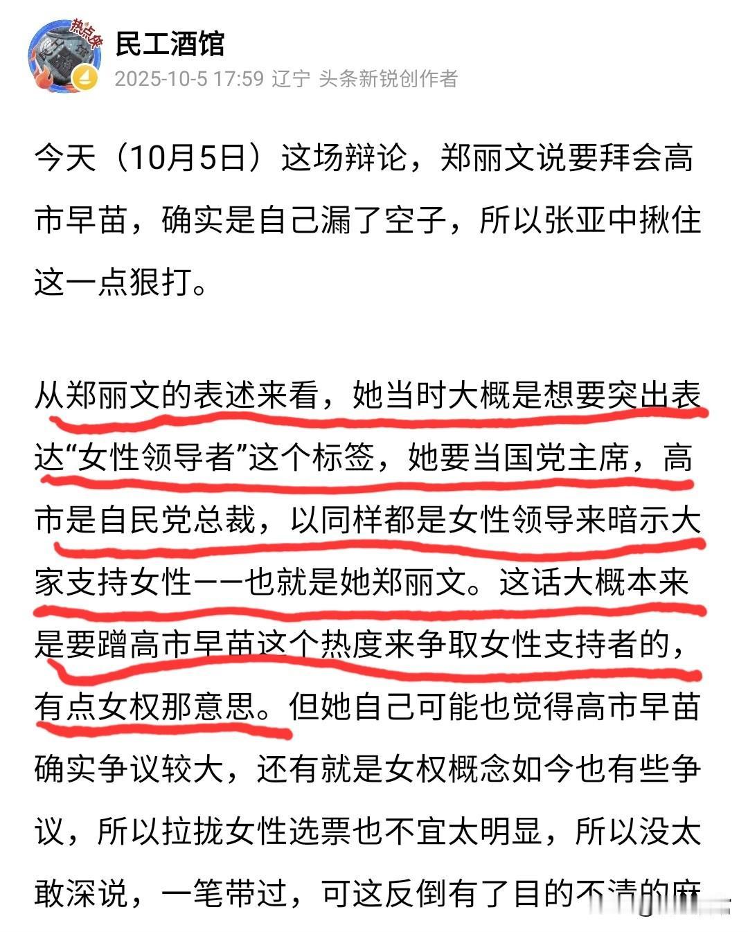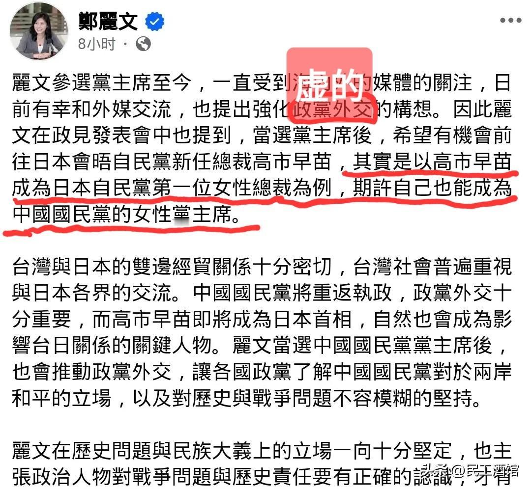 谁能想到高市早苗这几天这么火,第一个烧伤的竟是湾省国党郑丽文,还是自己引火烧身。她的回应,跟我猜的几乎一样。很多人都没仔细看她的原话,或者看过原视频但也不会“听话听音”,所以没听出来。 我在10月5号那场辩论刚结束没多久就说她是想蹭高市早苗这个所谓的“很可能成为首位日本女首相”的热点话题来争取女性选票,有女权那意思,但是她没说太明白,被人揪住了漏洞,玩砸了(图二是我的部分原文)。 而如今她发文对此回应,看图三画红线部分,这句勉强算是她的实话,这才勉强算是她当时那么说的真实目的,她倒也勉强算是承认了,连说三个“勉强算是”,是因为她还不太老实,只说是“期许自己也能……”,实际上是通过蹭那个热点来暗示或影响那些容易从性别角度投票的人,也就是有些女权思想的人,给她这个女人投票。 从她回应的全文来看,她又扯出的那些见高市早苗的意义,就纯属硬拗了,她把重点转移到“政党外交”上,这一点是虚的,至少是次要的。但她现在只能嘴硬强调这一点,这个我基本也猜到了,因为很好理解,第一是想搞一点女权获得选票那个目的,不太方便明明白白讲出来,第二是所谓政客往往不愿意认错,即便知道错了也得死硬到底,想办法把这事说成合理的,这被一些人认为是政客的基本素质。 不过我倒不认同这种理念,假设是我,我就老老实实承认错误,多在解释自己当时说要见高市早苗这种话的真实目的是想争取那些更愿意支持女性身份的那些人,至于说实话会起到什么效果,事已至此,听天由命吧。至于她重点强调的“政党外交”,我是不会讲的,因为在这一点上嘴硬,有些把别人都当傻子了。 确实有傻子,还不少,他们会觉得郑丽文说要见高市早苗没问题啊,有什么不可以见的呢,一方面湾省政客哪个不想见日本人,另一方面大陆也没跟日本断交啊,所以大陆领导不也有见日本政客的时候吗,怎么能见不能说,她就说句实话不行吗? 这样想的就是傻子。 至于为什么,我图二里那部分截图的完整全文中写了,感兴趣的可以找出来看,我懒得再说了。不感兴趣的、坚持认为郑丽文说这种话没问题的、觉得很多人是被张亚中带偏的一些人,你们也不用看,就坚持你们自己认为的就行。各有各的看法嘛,反正在我看来肯定是傻子才会那么看,但你们也可以认为我是傻子。 其实这件事就是郑丽文自己大意了,一不小心露出些自己并无什么真才实学倒是有投机本性这一点,搞出了个自己引火烧伤自己的事。就这点事,我看未必会有如网友说的那些严重后果,毕竟湾省人的脑子嘛……投机又亲日的不少,像上一段说的那种傻子也不少。