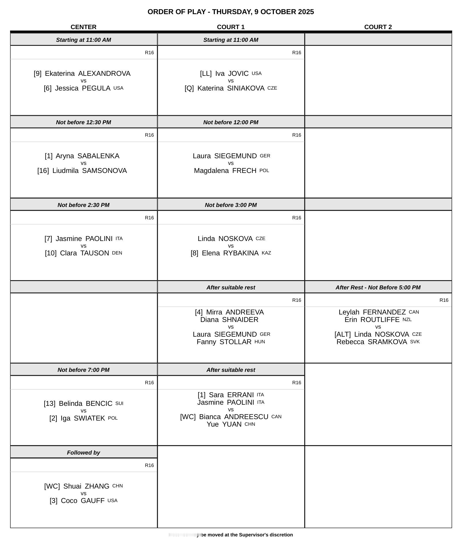 11:00 - [9]亚历山德洛娃 vs [6]佩古拉
