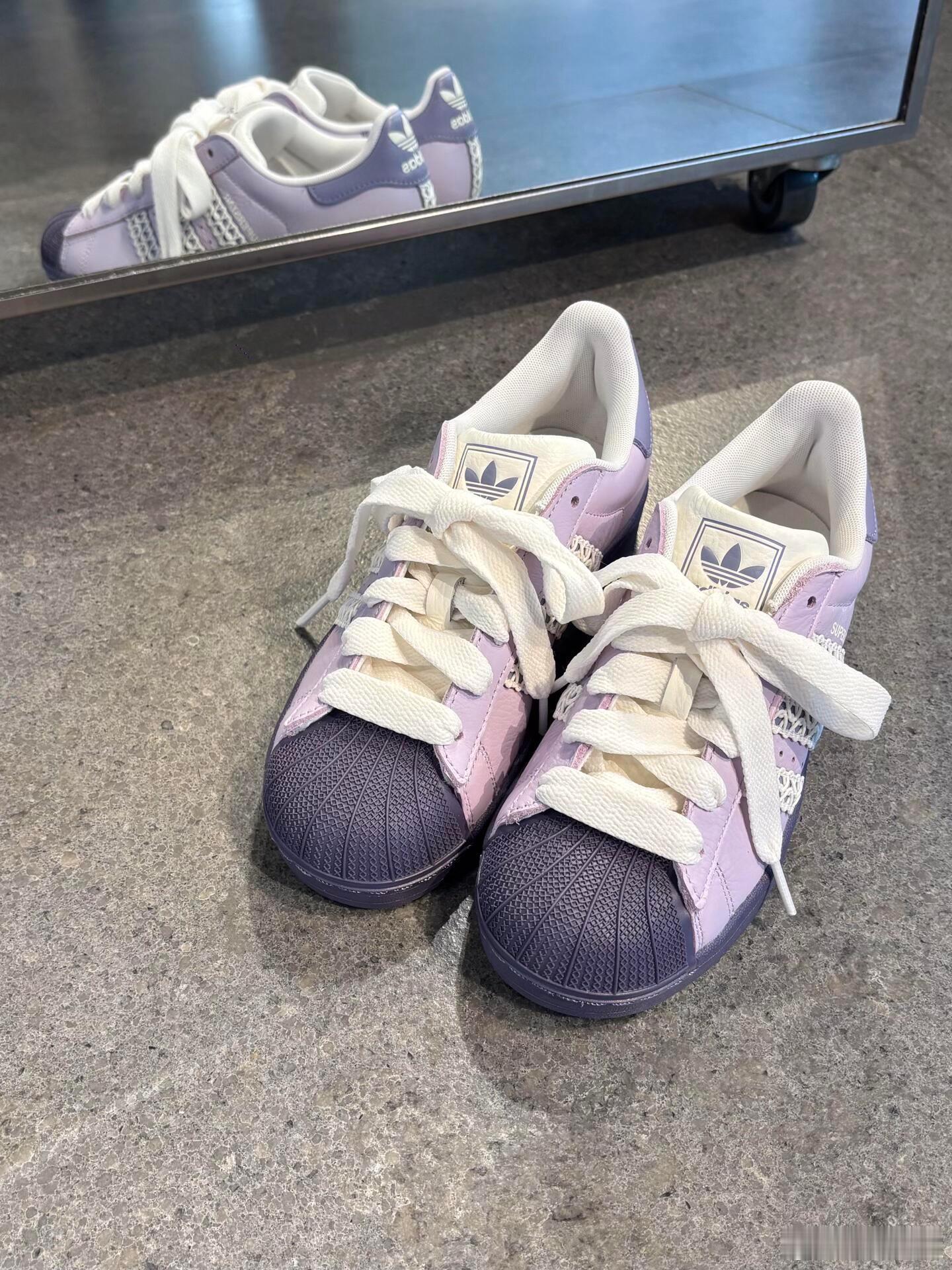 这双阿迪达斯(adidas)Superstar运动鞋,完美演绎了经典鞋型的时尚新貌。鞋款延续了其标志性的“贝壳头”设计,为鞋头提供了出色的保护与极高的辨识度。鞋身主体采用优雅的淡紫色,与深蓝色的橡胶鞋头和鞋底形成和谐而富有层次的撞色效果,白色鞋带则起到了清爽的点缀作用。