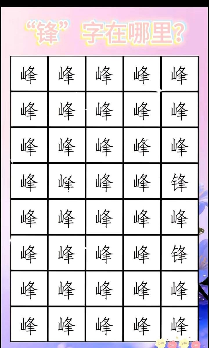 满屏“峰”里找“锋”,3秒找不着就老眼昏花? 我盯着手机,两个“锋”字愣是花了18秒。 剑桥的人说,每天练10秒,大脑年轻3岁,我信。 为啥? 山字旁和金字旁就差一横一点,眼睛一糊就错过,大脑却得拼命调焦,像给生锈的齿轮上油。 抖音把这做成小游戏,2亿人跟着点,点着点着,血压降了,字也写对了。 汉字本来长得像,写错一辈子,现在用找字代替罚抄,孩子不哭,大人不吼。 我打算把“未末”“己已”也排进去,每天混一张,让老花和提笔忘字一起滚。 找得到找不到,都是给脑袋做广播体操。 今天你找了几秒?留言报数,看谁先甩掉老花镜。