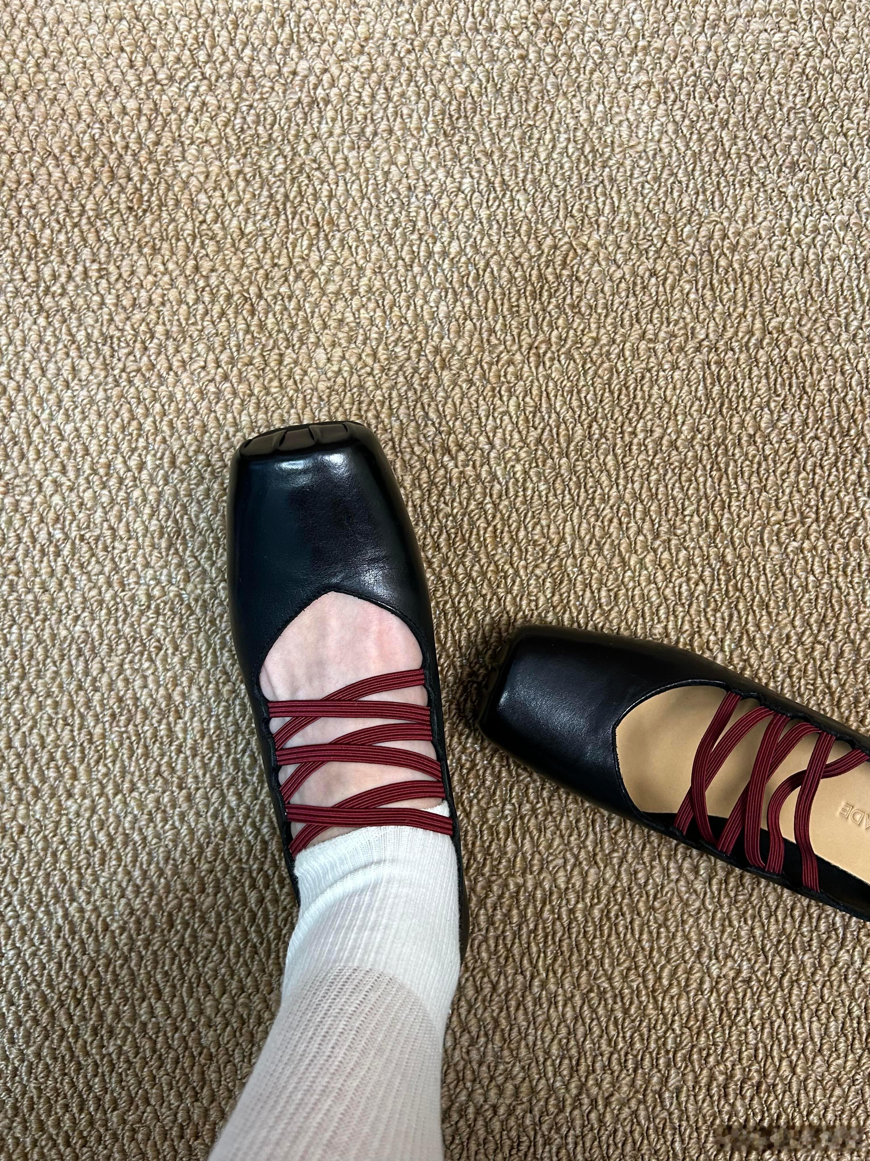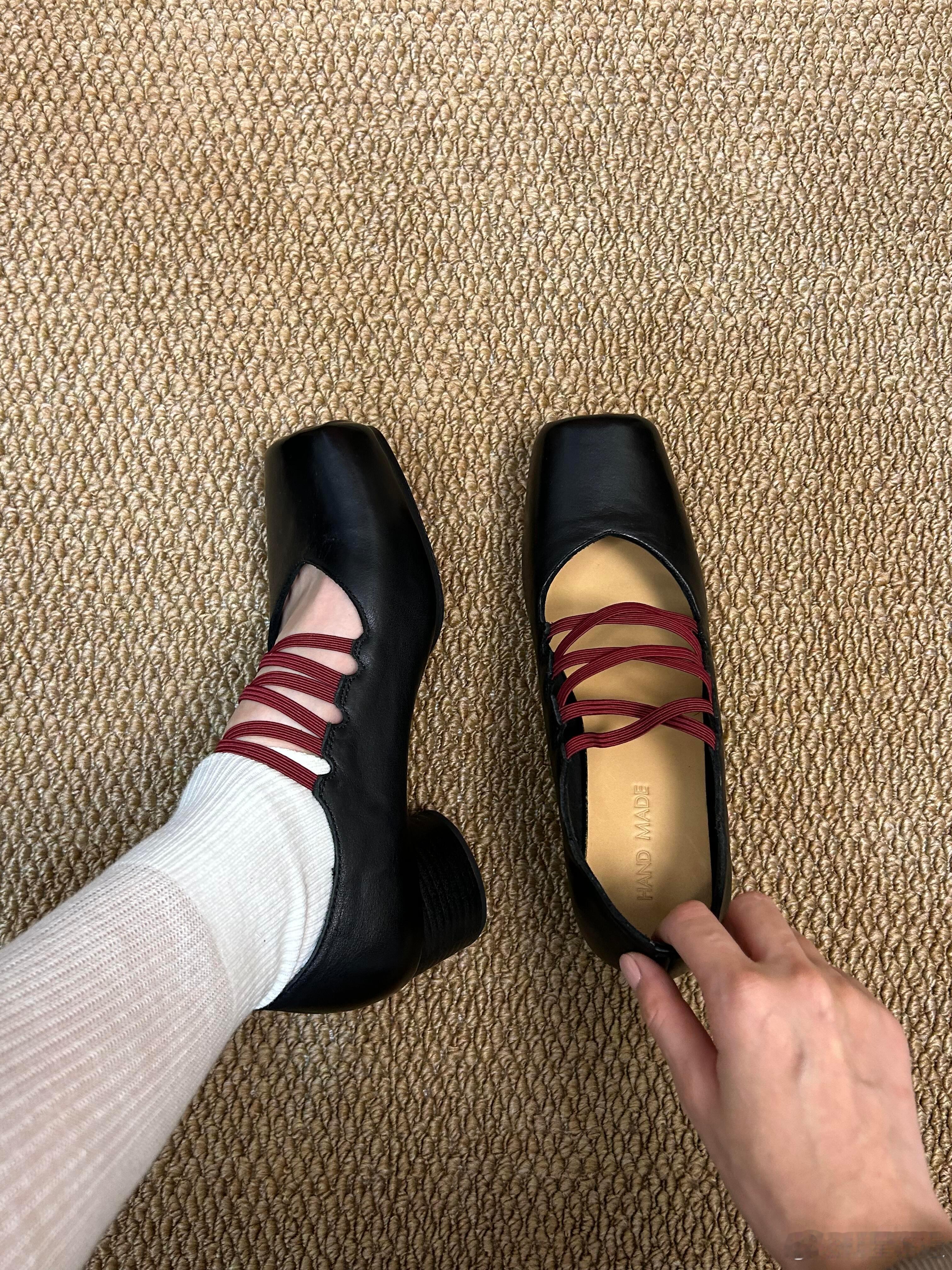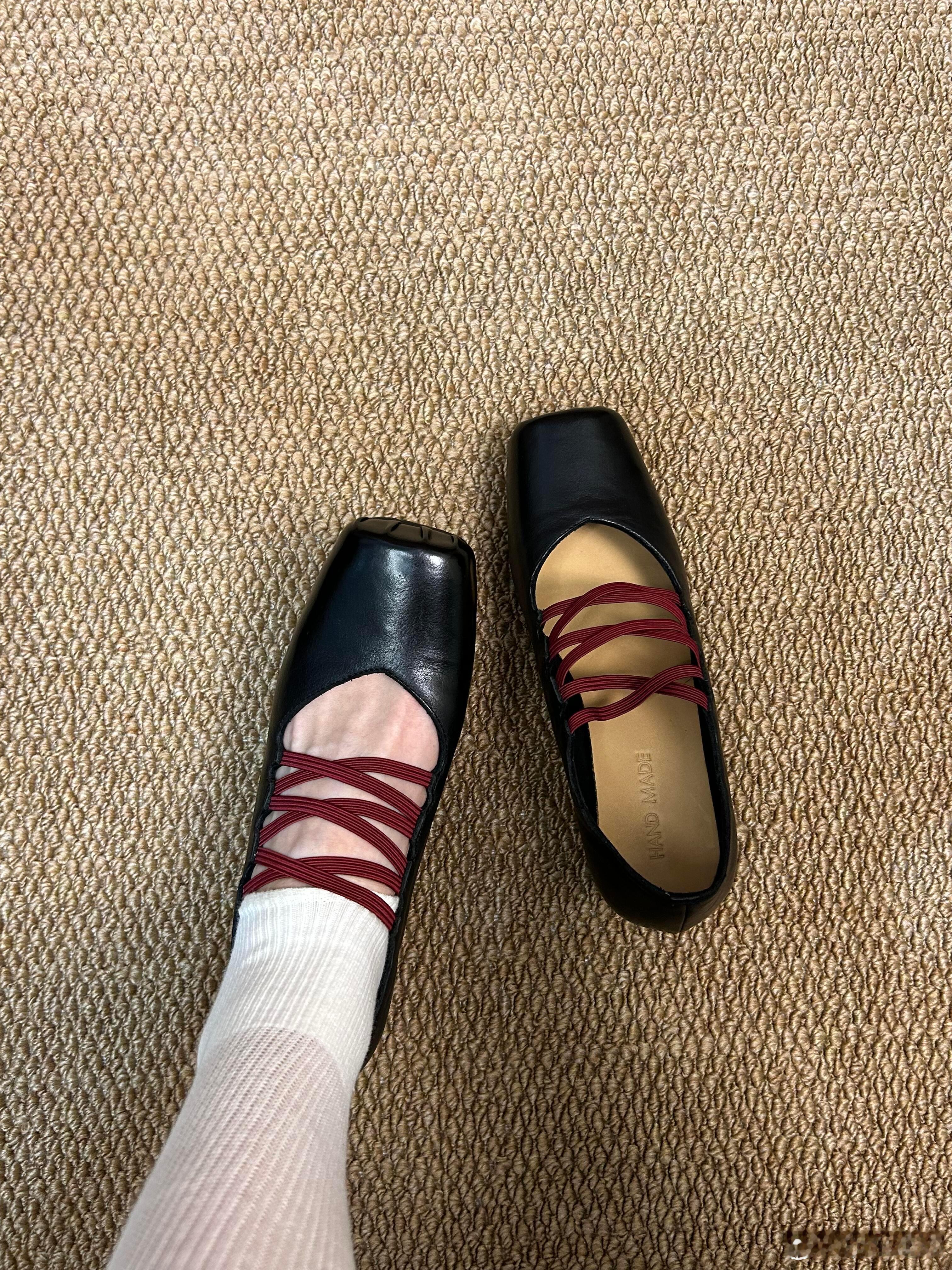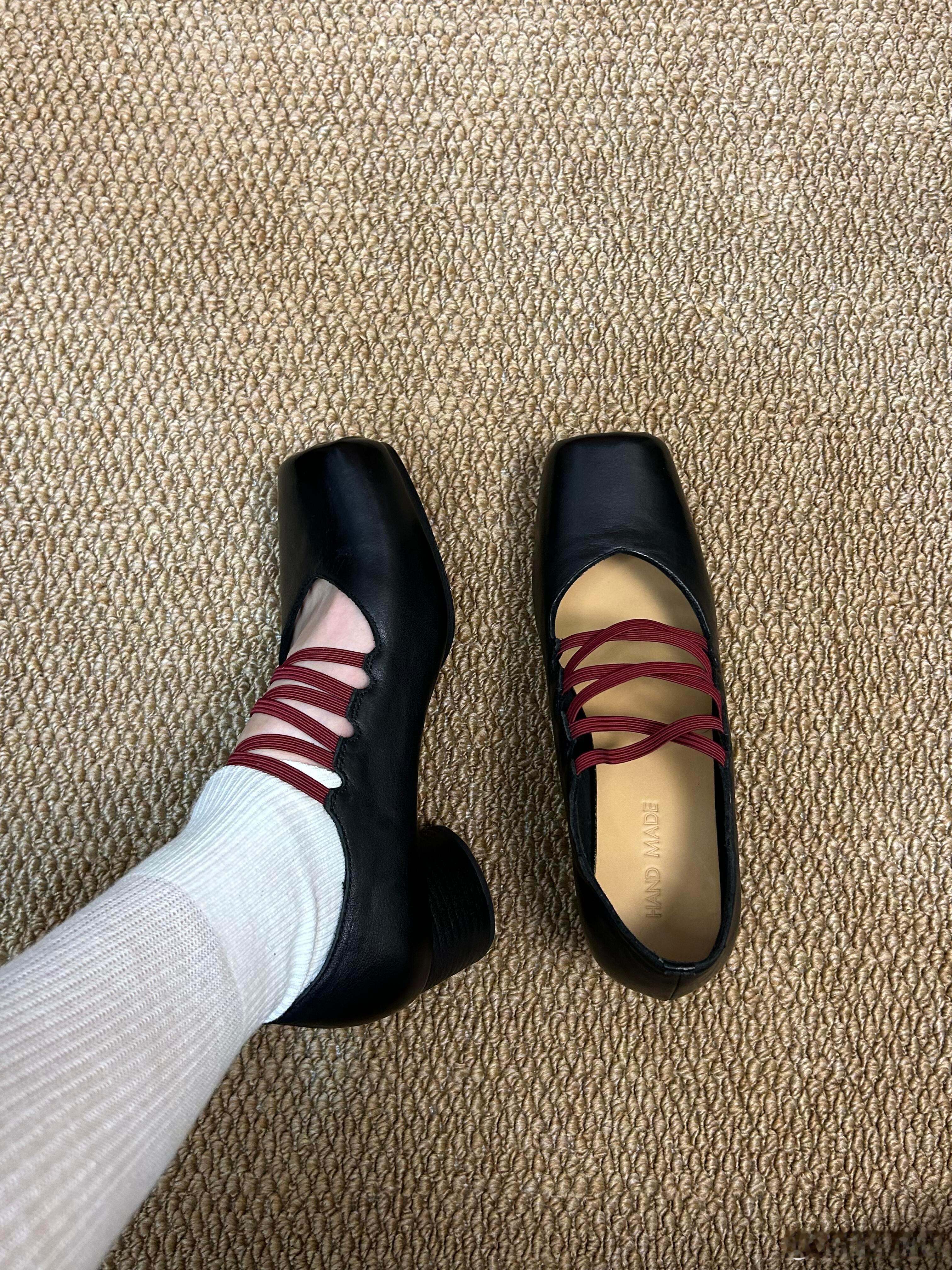 这双鞋是一款极具设计感的黑色手工平底鞋。其最突出的特点是方头鞋面上交错编织的数条酒红色弹性细带,如同精美的缎带装饰,不仅塑造了独特的时尚轮廓,也提供了舒适的包裹感。鞋子采用优质皮革制作,内衬米色鞋垫上清晰的“HAND MADE”字样彰显了其精良的制作工艺。整体风格简约复古而不失现代摩登气息,非常适合追求个性与品味的日常穿搭。时尚鞋履