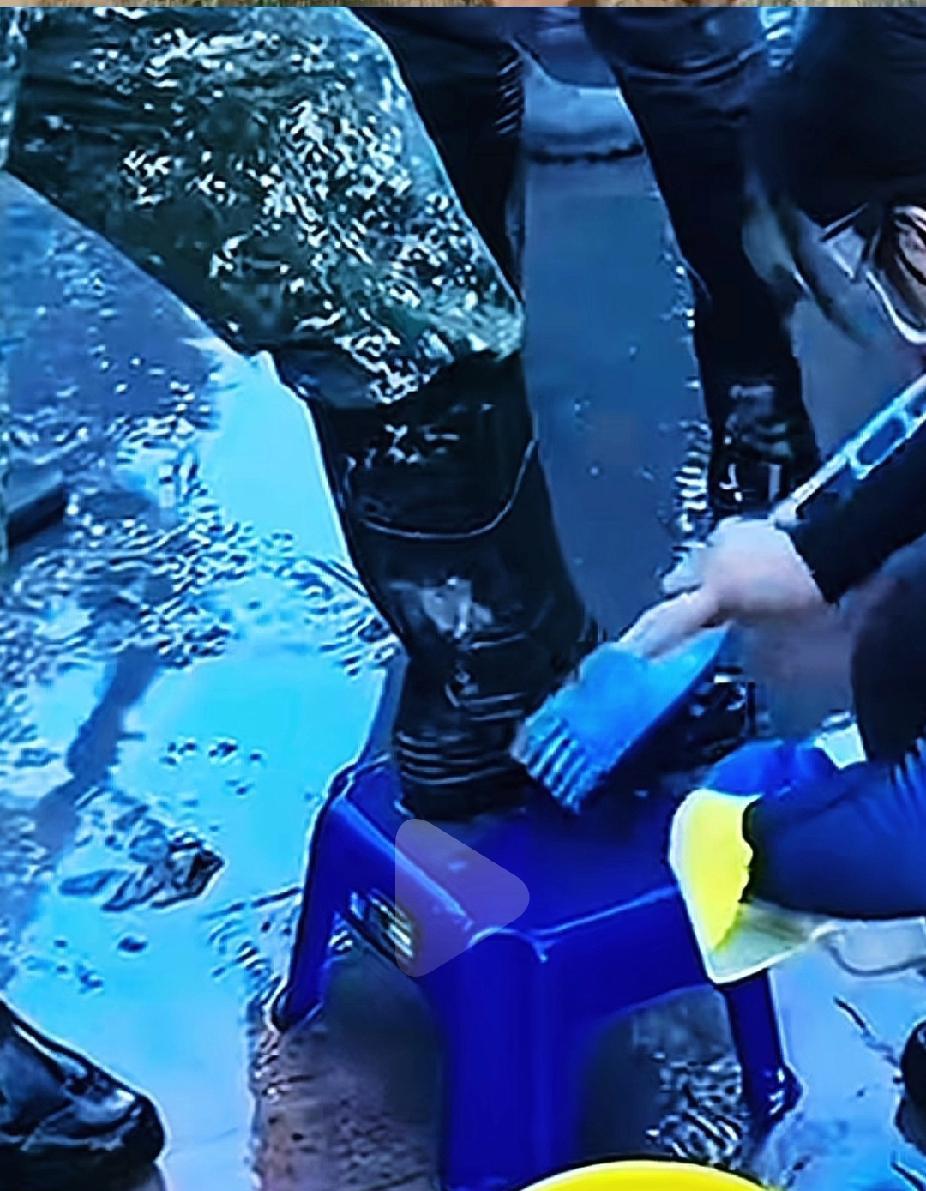 中国台湾花莲县救灾现场,有人为台湾救灾军人擦鞋。不知道是老百姓还是义工,如果是救灾的解放军,人民群众要给解放军擦鞋,子弟兵恐怕脚都不敢伸出去。如果敢这么干,估计处分,关禁闭都是轻的,弄不好会开除军籍。