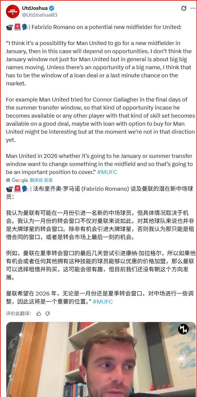 曼联有没有机会在冬窗签下一个中场?罗马诺这等于什么都没说:一切皆有可能 罗马诺的意思是,曼联肯定考虑签下一个中场,只不过这需要看时机,如果没有中场球员流入市场,曼联不会考虑的,而且不排除曼联会考虑租借半个赛季+买断的方式。 过去两个赛季,曼联都在冬窗租借出去几名一线队的球员,并且都附带了买断条款,比如上赛季拉什福德租借给维拉等等方式。罗马诺说的时机,应该就是等待这种机会,那么,本赛季在布莱顿状态低迷的巴莱巴,有没有机会在冬窗流入转会市场?不知道的。 依然是夏窗考虑的问题:曼联要补充的中场,是B费这个位置的,还是卡塞米罗这个位置的。如果是B费这个位置的,意味着来了很难打主力,而且梅努肯定会被挤走。如果是卡塞米罗这个位置的,则是考虑夏窗的时候卡塞米罗、乌加特要走一个。
