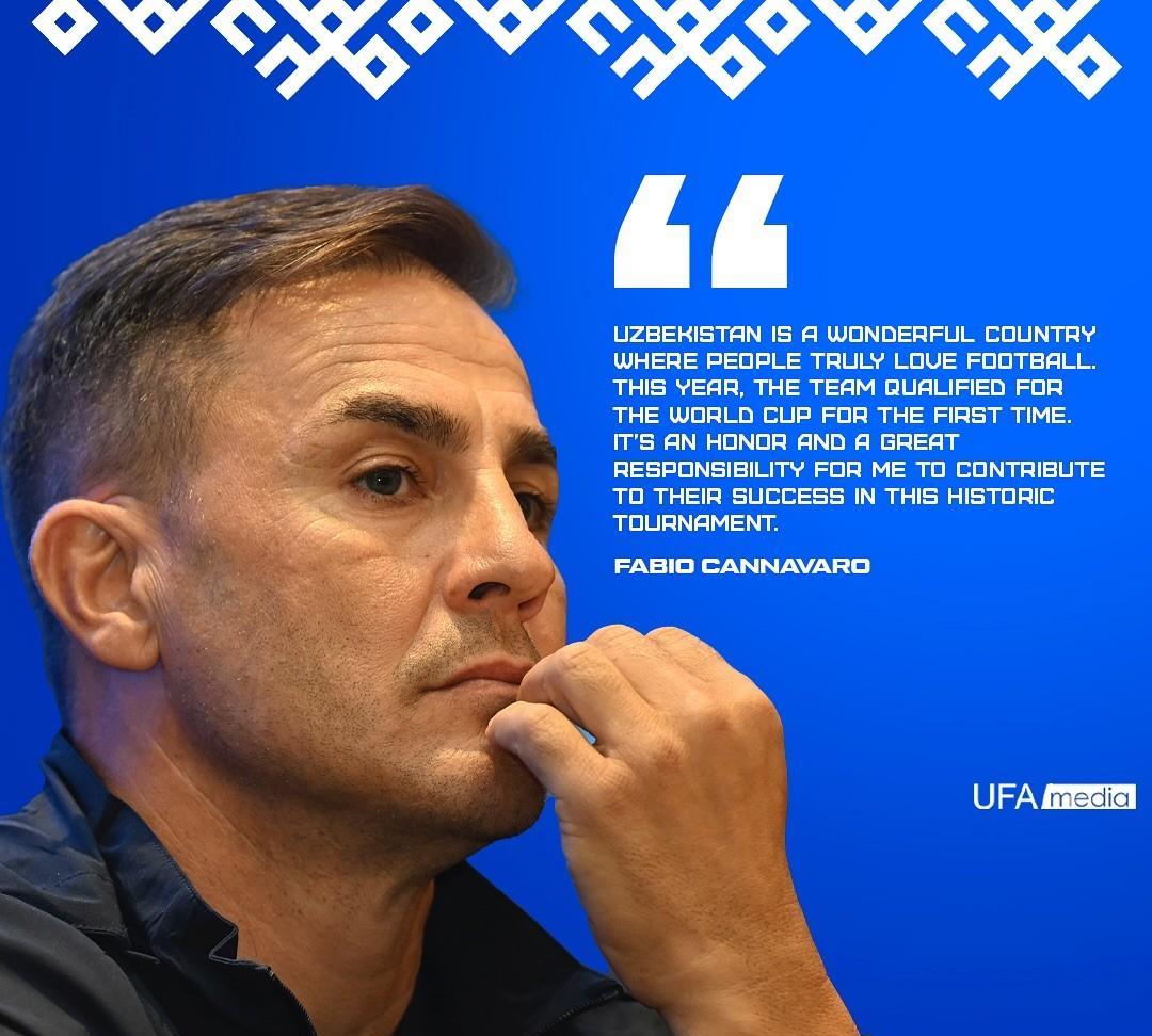 意大利名宿卡纳瓦罗正式亮相乌兹别克斯坦,在和球员与媒体的见面会里他依然展现了他在中国时的高情商,对乌兹别克斯坦上下都表示了高度的赞扬他也认为在这将是他职业生涯的高光时刻,他认为在世界杯上他能带领肖穆罗多夫们创造奇迹!