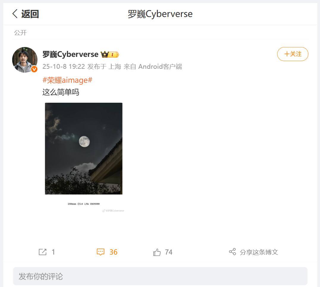 这个中秋大家都在忙着拍月亮,荣耀首席影像工程师罗巍也发了一张,随手拍月亮的照片,单独拍月亮因为有算法加持,所以会清晰许多,但是有不同光源影像的情况下,例如前景树木、房屋,背景中的流云,在这种情况下拍摄的月亮,这张确实蛮好,盲猜荣耀Magic8 Pro随手拍 #万能生活指南##畅聊数码新品##数码资讯#