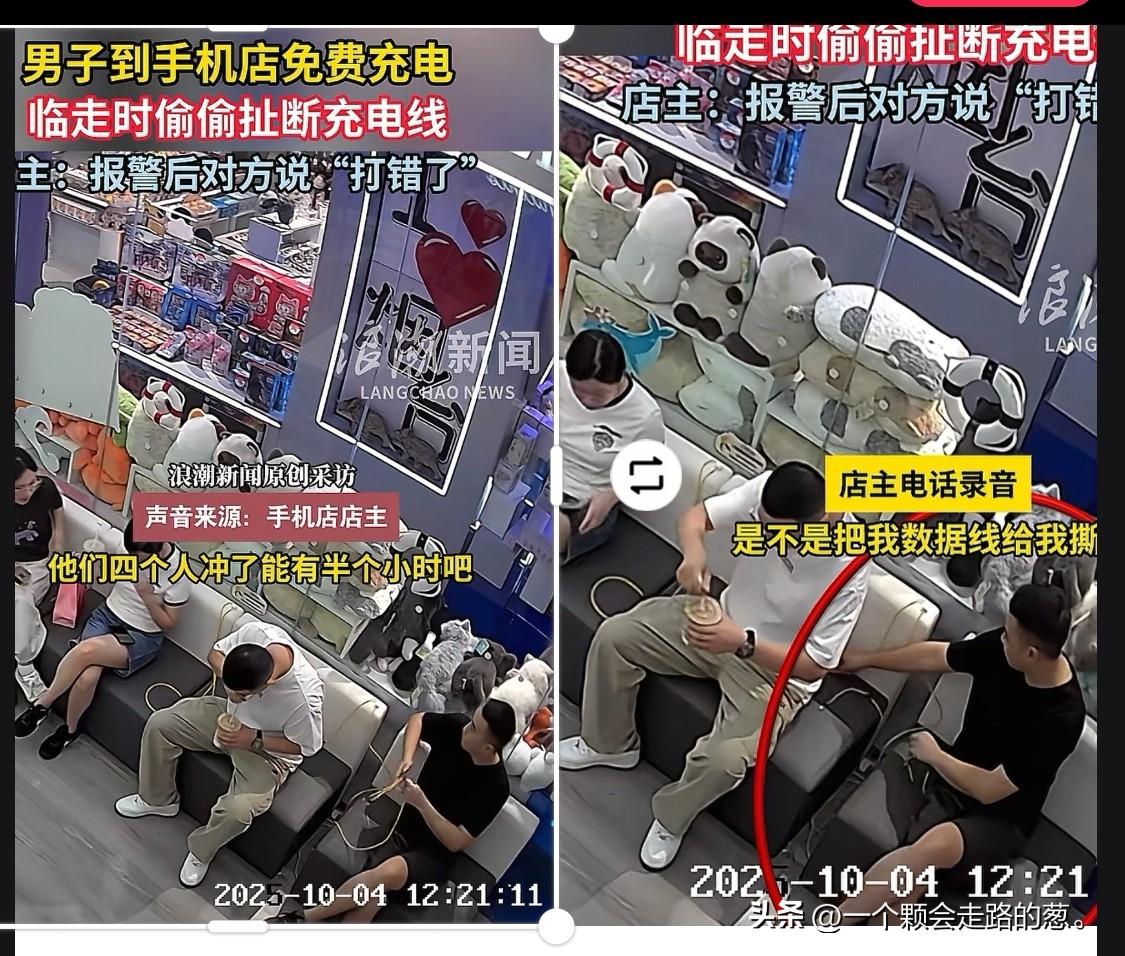 现在全网最后悔的应该就是这四个人了吧, 特别这个叫肖业鹏的黑龙江哈尔滨人, 家庭住址和工作单位都被扒了出来,10月4号的这四个人去山东烟台,手机没有电了,跑到一家店里休息。 当时老板在忙,没有注意几个人的行为,店里正好可以免费充电,这四人在店里休息了一会,就打算离开。 离开之前肖业鹏还特意在店里转悠一圈,发现老板在忙,临走之前应该是想把充电器拿走,发现拿不走,就把免费的充电线全都给撕碎了,做好一切赶紧叫上同伴离开。 别人给你方便,你给别人麻烦,人能坏到这种地步也不怕打雷的时候被劈,同行的白衣女子在离开的时候还把嘴里的口香糖塞到凳子下面,什么样的结交什么样的朋友。 在店主报警后,找到他的号码打过去,他不承认是自己做的,东西不值钱,老板也不要对方赔偿,只要求道歉。 按照东北人这个热情劲,相信这四个人很快就会被找到,这四个人以后在东北是混不下去了,出门一趟把东北人的脸都给丢完了。 撕线哥好像知道问题的严重性,现在电话已经停机,不知道是不会换号了,有知道的朋友去他家门口直播,让他火起来!