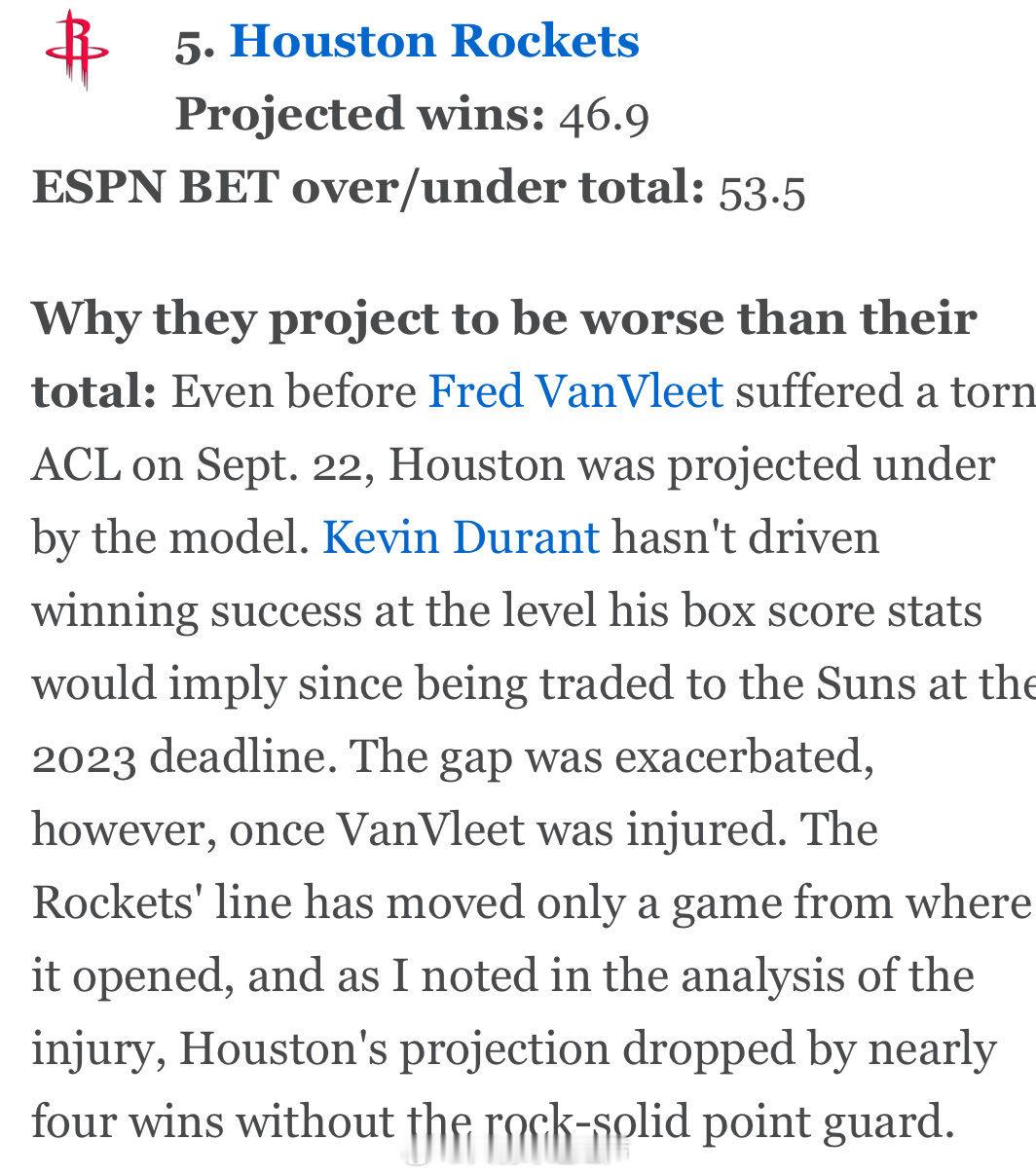 ESPN预测火箭队今年将赢得 47 场比赛(排名第5)......远低于他们预测的53.5的上下限。