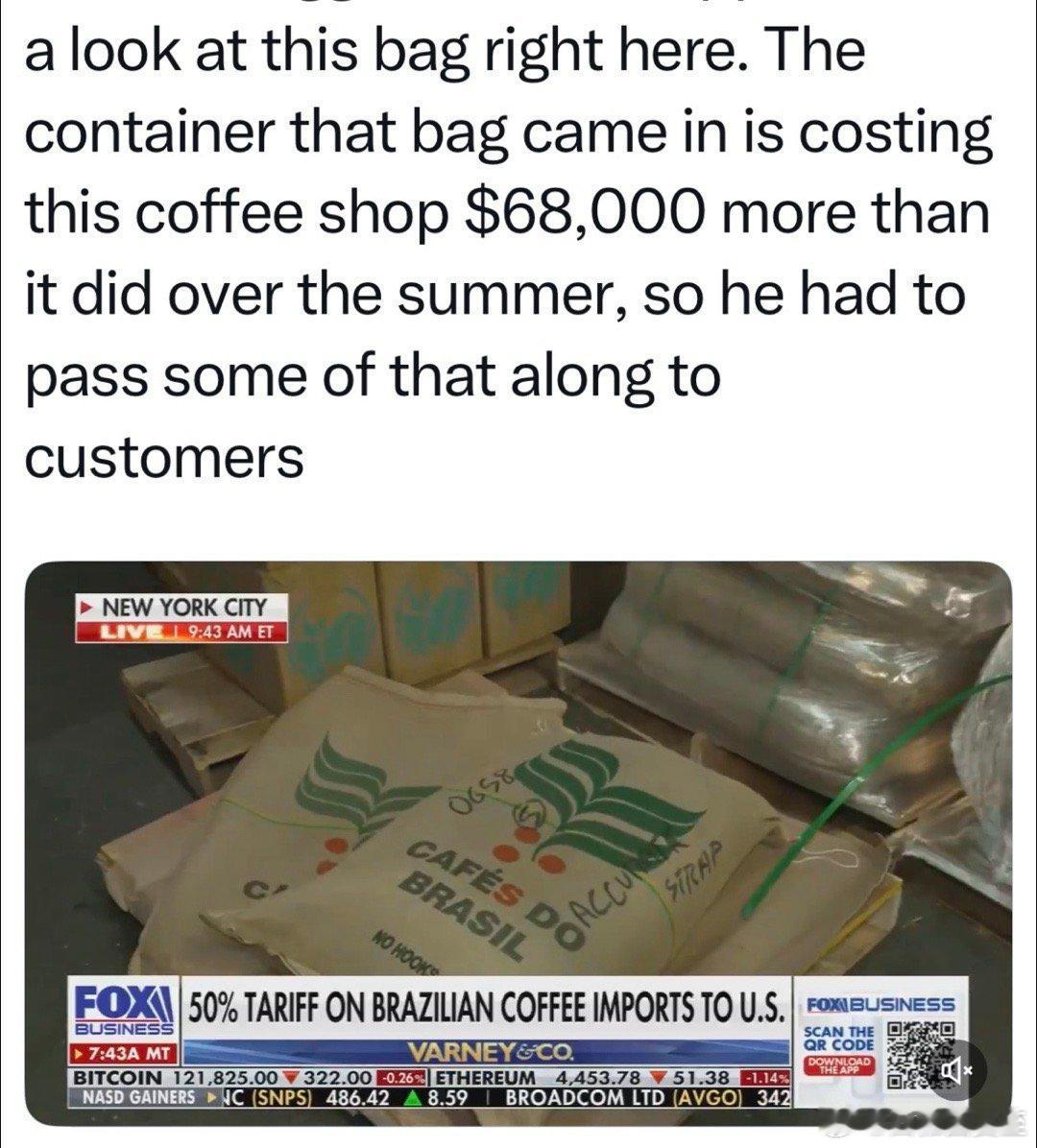 Fox Business: 烘焙咖啡价格,一年涨了22%…给巴西加50%关税,那是美国最大的咖啡供应商…批发的大袋咖啡,每集装箱价格,比去年夏天贵了$6万8,这钱总得有一部分转嫁给消费者☕️ ​​​