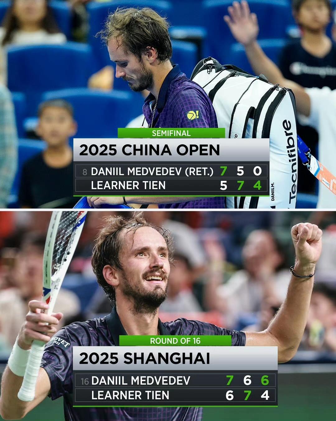 苦熬三小时,梅德维德夫带着抽筋的双腿,奇迹般逆转苦主勒纳·钱,不仅报了一周前中网抽筋退赛之仇,也免了叫爸爸之耻。 梅总7-6/6-7/6-4勒纳钱 第一盘耗时75分钟,梅总虽然艰难拿下,却留下了体能亏空的后患。 第二盘梅总错过3-0,40-15的速胜机会,情绪出现波动,抢七开始前突然抽筋,站着打完抢七之后,才等来理疗师治疗。 决胜盘,梅总仍像中网一样坚持作战,最后关头勒纳·钱在压力下动摇。 图二就是最好的动力!