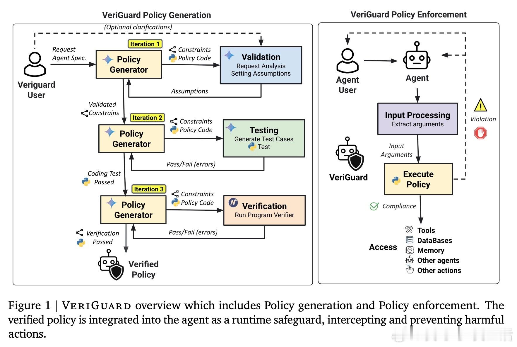 1️⃣ 离线阶段:基于用户自然语言安全需求,利用LLM自动生成行为策略代码与形式化约束,结合自动测试和形式验证(利用Nagini工具)迭代优化,确保策略满足安全规范,避免模糊和不一致。