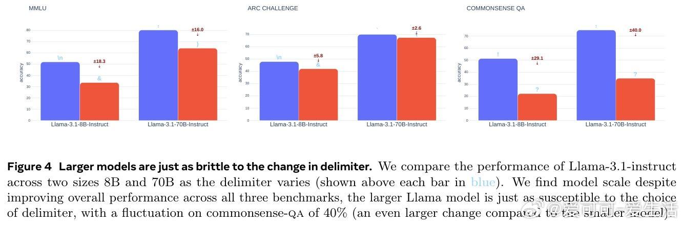 2️⃣ 模型规模提升(8B到70B)并未缓解分隔符敏感性,闭源模型如GPT-4o同样脆弱。