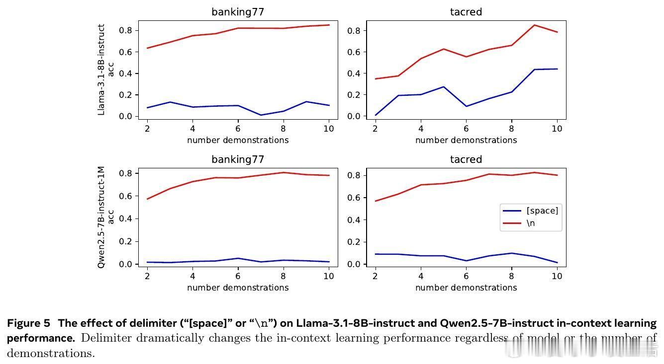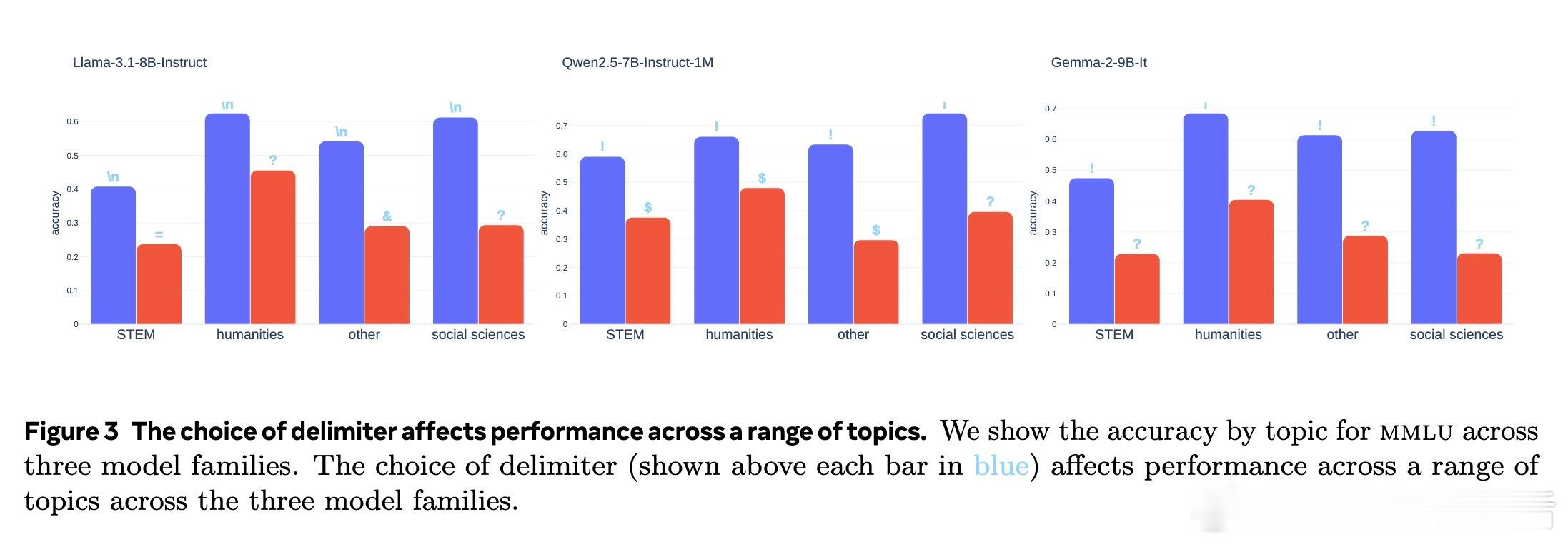 1️⃣ 评测中示例分隔符多样(逗号、换行、感叹号等),但不同分隔符对模型表现影响巨大,跨模型家族(Llama、Qwen、Gemma)和多任务均成立。