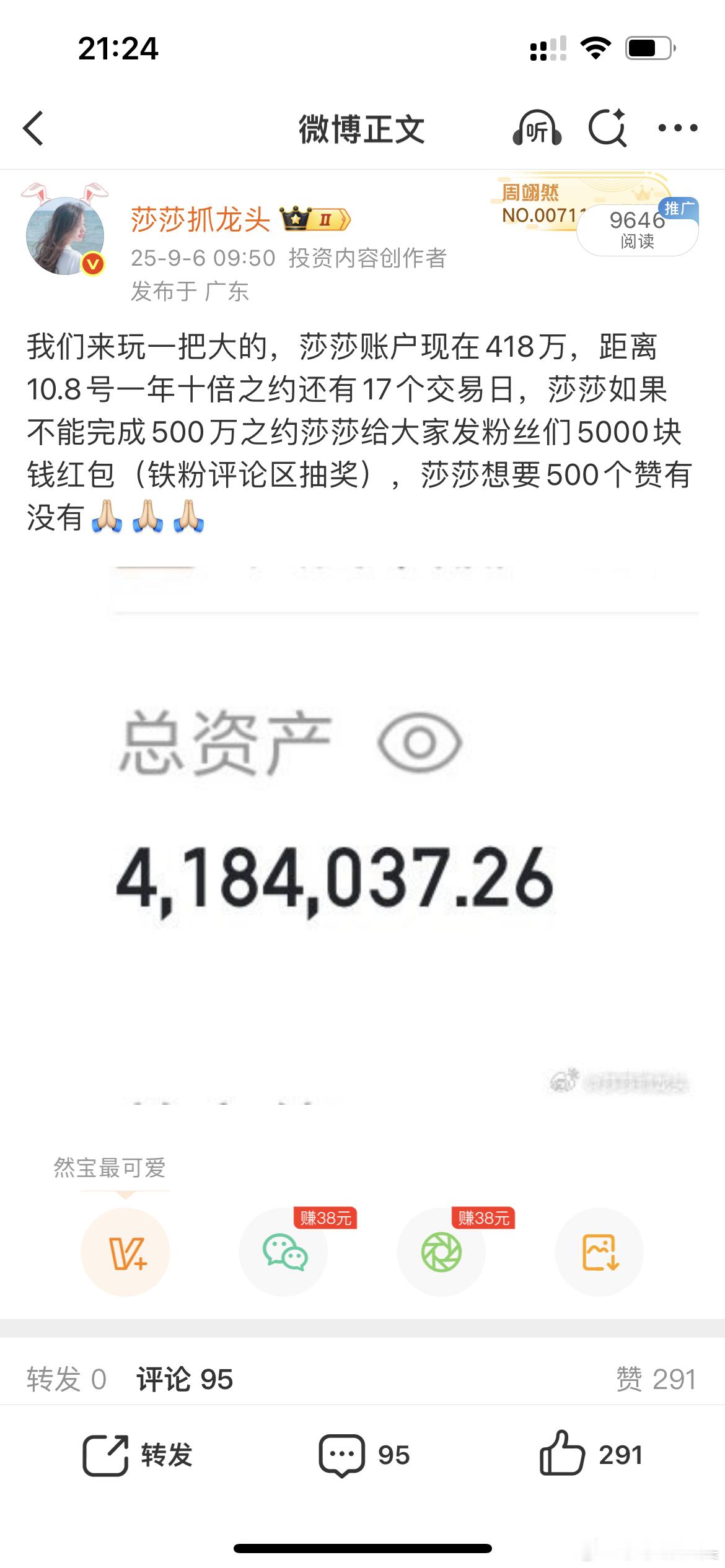 兄弟朋友们去年10.8号莎莎用50万本金开始这个账户的牛市之旅,当时很狂妄夸下海口要用50万一年做到500万,经过一年的牛市莎莎一路艰辛的走来莎莎没有让粉丝们失望,终于在牛市完成了一年十倍之约,当时9月6号的时候账户才418.4万,很多人都觉得莎莎不能完成了,莎莎之前也是比较谨慎几乎很少满仓干,后来为了完成十倍之约莎莎才满仓操作的,好在不负众望完成了,那么粉丝们决定莎莎是定个什么目标好呢?,大家评论给点意见我参考一下[作揖][作揖][作揖]