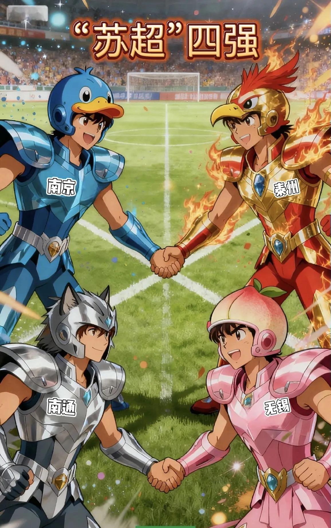 苏超,继续梗不断。 有请苏超四强。 南京:我是南哥,四强我来了。 泰州:我又名凤城,凤凰传奇的歌真的不错。 南通:我来自狼山,我很孤独,独孤求败。那位同学,你问如何做题啊,后续我们单聊啊。 无锡:我来自太湖,“太”的意思就是很大很大,特别大,还可以引申出很厉害的意思,阿苏、常宝,你们说是吧。 #苏超梗王争霸赛#