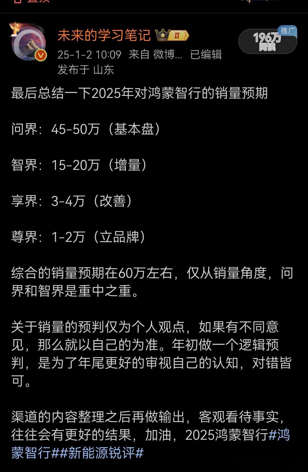 至于目标,之前张兴海董事长曾经在内部信中提到过,3年实现百万销量,也就是27年达成一百万量的销量,这里应该是整个集团的销量。问界目前占全部销量的80%,倒推回来,25年完成50万台销量,后面两年实现复合增长20%即可达成目标