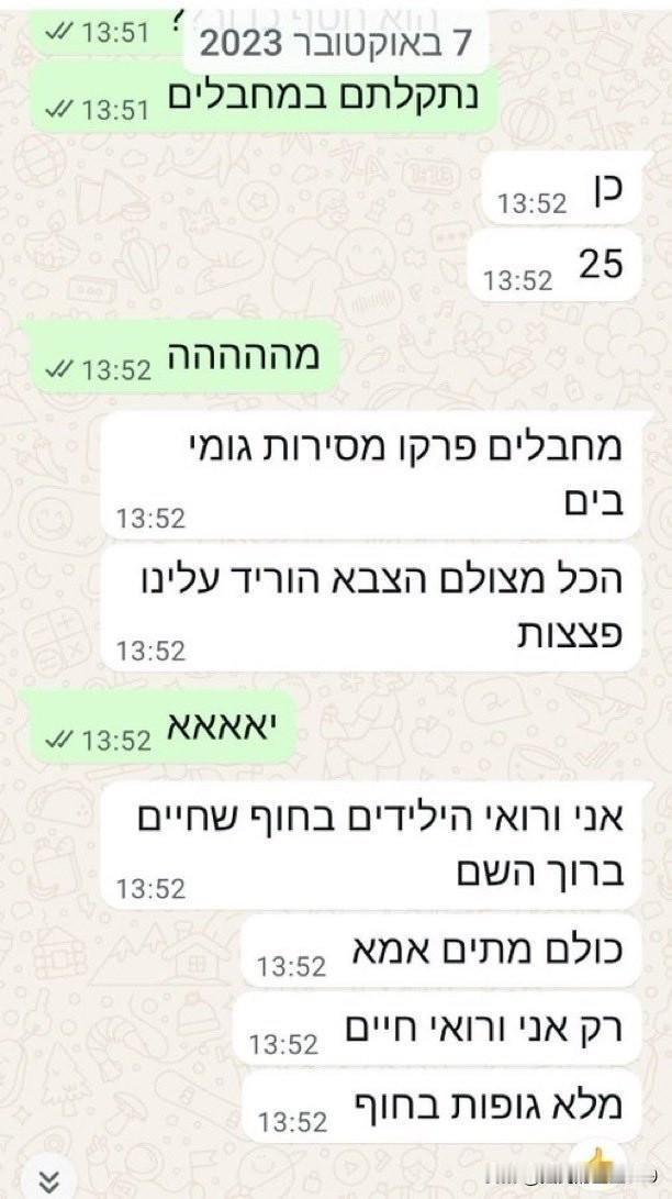2023年10月7日,以色列下达了“汉尼拔指令”,杀死了齐基姆海滩上所有人,包括哈马斯和以色列人。 关于2023年10月“阿克萨洪水”军事行动期间以色列军队在齐基姆海滩故意杀害本国民众的更多证据被公布: 5 月 10 日,以色列战争死者家属萨宾·塔斯接受以色列第11新闻频道(以色列广播电台)的采访,她儿子在2023年10月7日的齐基姆海滩冲突中死亡。她表示:“看起来那些在齐基姆海滩被谋杀的人拍摄了一些以色列国防军不想看到的东西。据报道,以色列死者手机中的所有录像在归还给家人之前均已被删除,显然以色列政府或军方存在隐瞒行为。 此前,阿林·什洛莫发布了她儿子马坦的 WhatsApp 聊天记录截图,当时马坦也在齐基姆海滩 Matan 正躲在 Zikim 海滩: 2023年10月7日下午1:51 •阿林:“你们遇到恐怖分子了吗?” •马坦:“是的,25人。恐怖分子从橡皮艇上下来。我把一切都拍了下来——(以色列)军队向我们投掷炸弹。” •马坦:“只有我和罗伊还活着。妈妈,大家都死了。海滩上有很多尸体。” 当后来被问及“(以色列)军队向我们投掷炸弹”是什么意思时,阿林于2025年10月7日在 Facebook 上回复(2025 年 10 月 7 日):“由于潜入的恐怖分子数量众多,(以色列)军队下达了‘汉尼拔指令’,轰炸整个海滩,包括海滩上的所有人。”