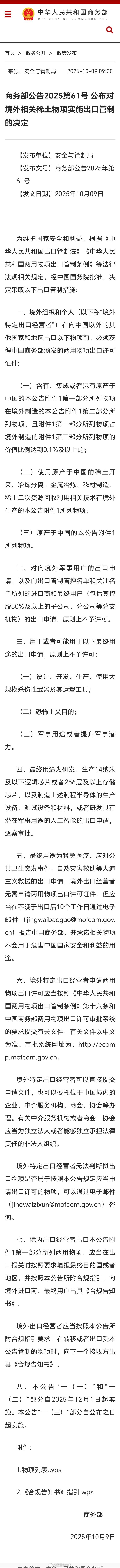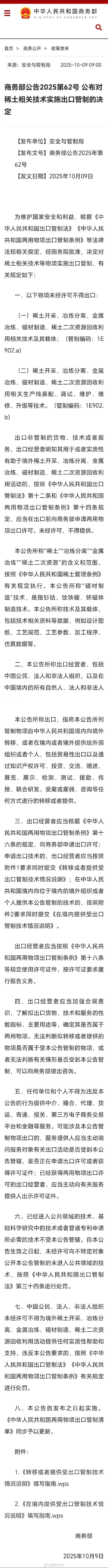 商务部对稀土相关技术实施出口管制10月9日,商务部公告,经国务院批准,决定对稀