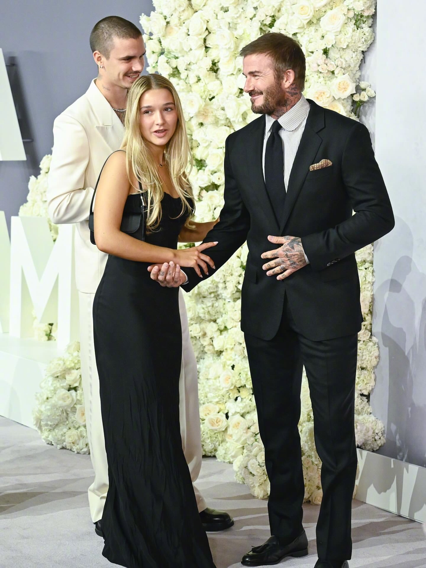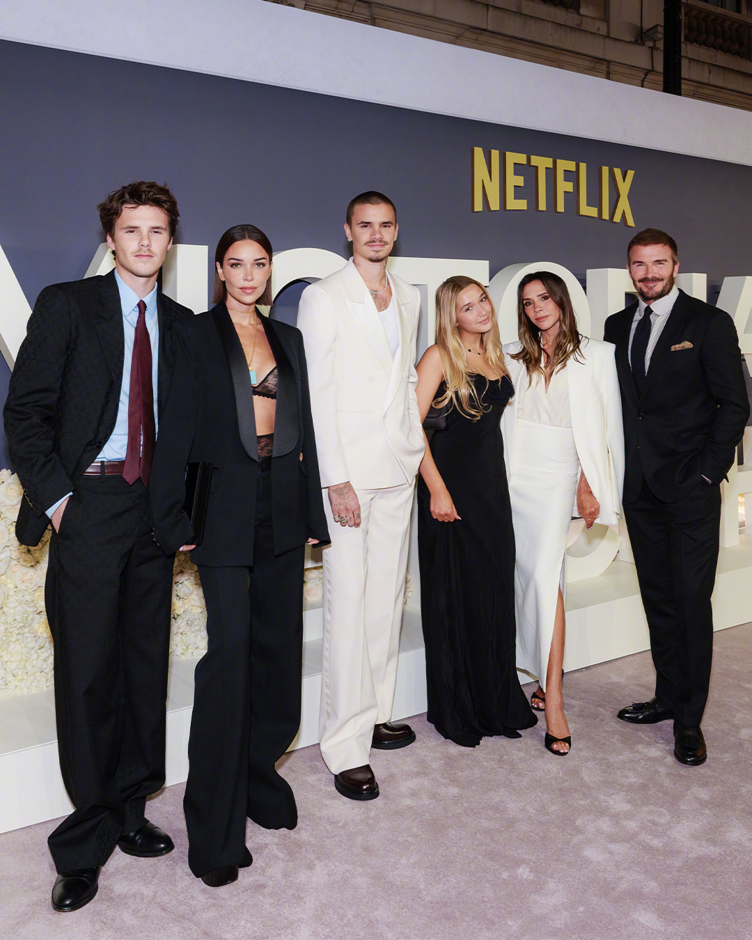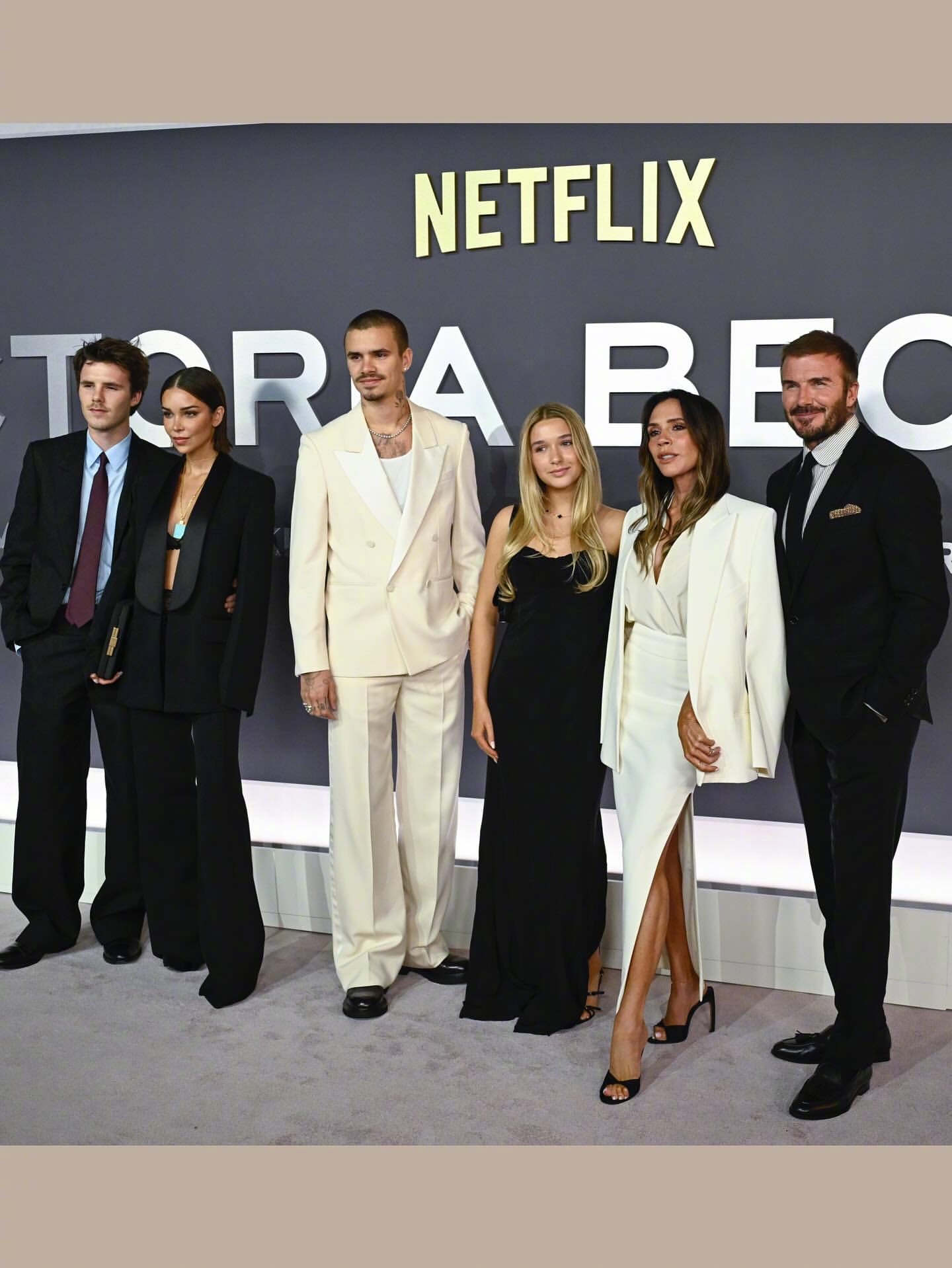 维多利亚·贝克汉姆身穿自己品牌的白色套裙亮相红毯,出席她全新 Netflix 纪录片《Say You’ll Be There》系列的首映礼。丈夫贝克汉姆及三个孩子——23 岁的罗密欧、20 岁的克鲁兹和 14 岁的小七女儿哈珀一同现身支持。克鲁兹的女友、29 岁的 Jackie Apostel 也一同出席。一家人黑白配优雅亮相。闺蜜伊娃及辣妹组合姐妹们也到场助阵。