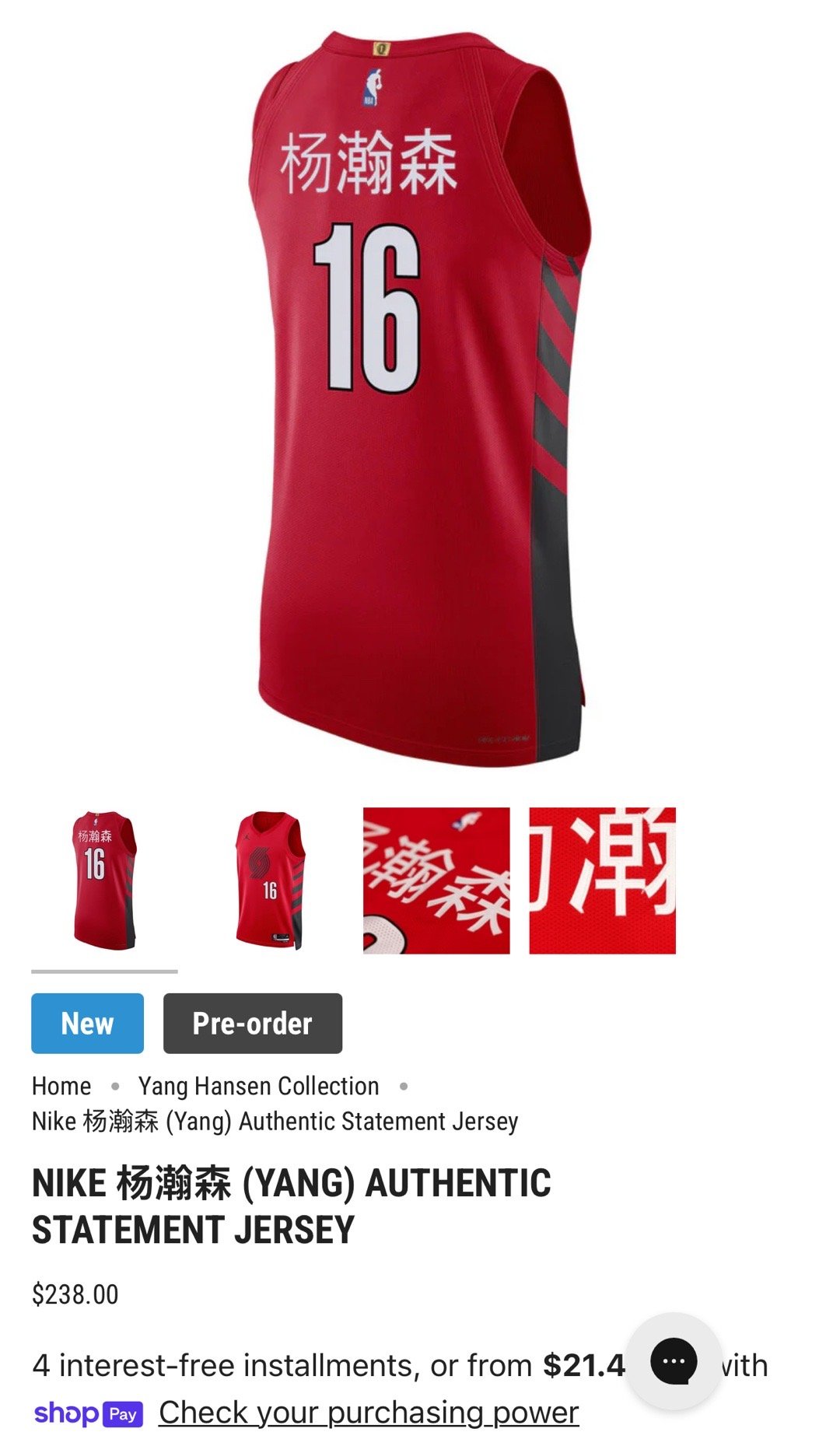 杨瀚森中文版英文版售价一致,也与开拓者其他球员球衣售价也一致。[二哈]波特兰开拓者