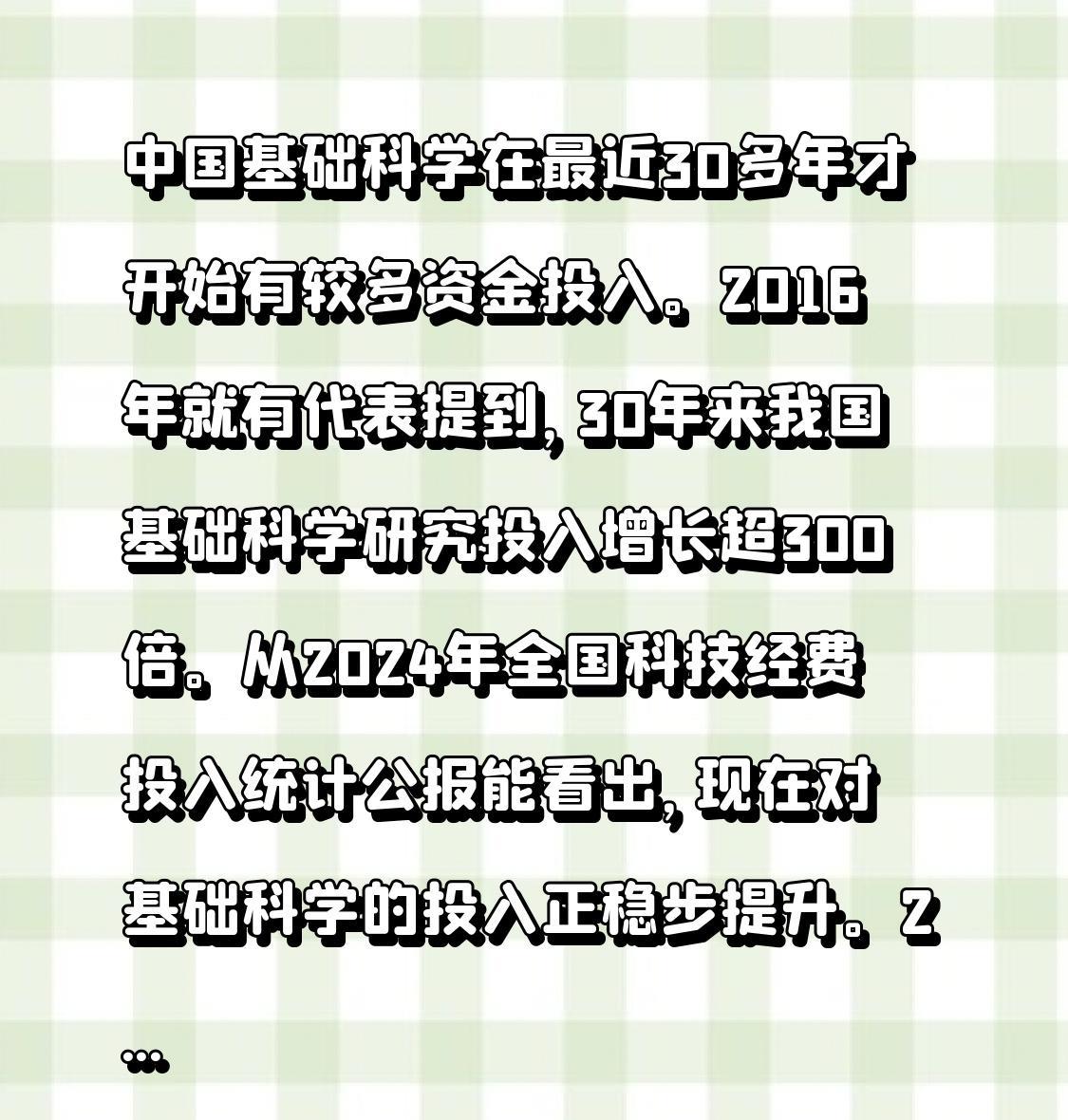 中国基础科学在最近30多年才开始有较多资金投入。2016年就有代表提到,30年来我国基础科学研究投入增长超300倍。从2024年全国科技经费投入统计公报能看出,现在对基础科学的投入正稳步提升。2024年全国基础研究经费达2500.9亿元,比上年增长10.7%,基础研究经费所占比重也比上年提升了0.11个百分点。虽然起步晚,但投入增长快,相信未来随着资金不断注入,中国基础科学定会取得更多突破。