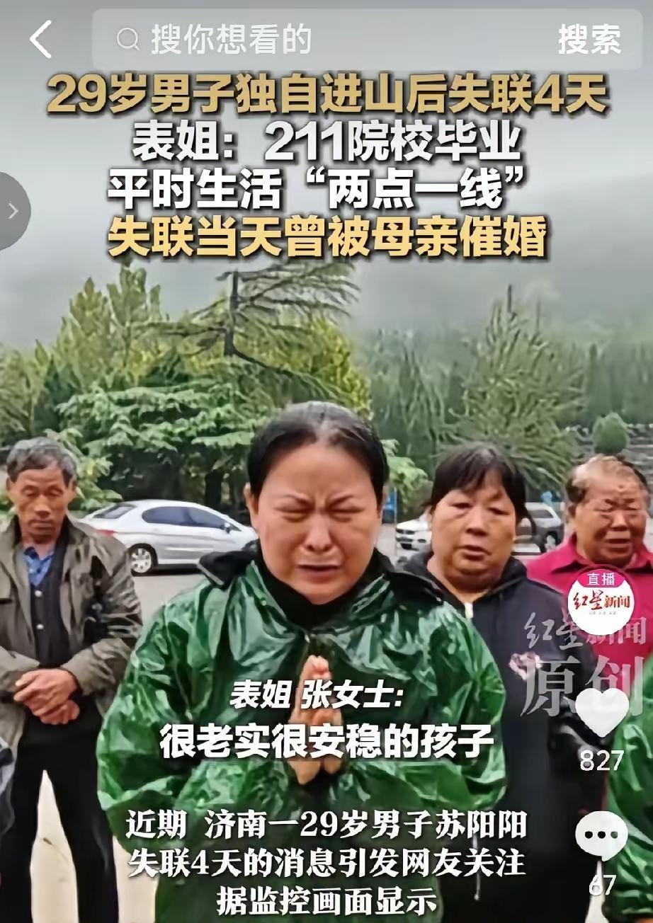 济南玉函山失联小伙已经五天没找到了,希望小伙只是赌气出走了。作为家长,要学会和孩子相处。 玉函山这地方不大,这么多人搜了这么多天也没个结果,确实令人很愁心的。济南这几天一直下雨,夜里温度比较低,山里就更低了。什么也没有发现,是坏消息,但也是好消息,意味着人还有活着的可能。 据了解,小伙进山之前曾经被家长催婚,发型还被家长指责了,一气之下自己去卫生间剃了个光头。 家长催婚,本意上是好的,希望孩子有个家。但是吧,这几十年,是科技飞速发展的几十年,也是社会结构、社会意识剧烈变化的几十年。很多老观念已经不适应当下的社会情况了。 就拿结婚来说吧,其实有条件谁不愿意结婚呢?毕竟结婚这事已经有了几千年,早就刻在基因当中了。但是当下结婚确实很难,就算结婚了,也未必能走远,这事老一辈人无法理解的。 而且现在年轻人压力之大,也是老一辈人理解不了的。 只能说,社会变了,老一辈观念未必合适当下社会情况。 就拿婚姻观念来说吧,现在婚姻已经不是过去那个相亲看对了眼,就能过一辈子的时代了。离婚是家常便饭,甚至单亲家庭已经占了相当大的比例。 所以,做父母的要学会理解孩子,要学会放手。孩子的婚姻,交给孩子自己来解决。要是真的结不了婚,单身也不丢人。毕竟单身总比天天吵架的婚姻要好。
